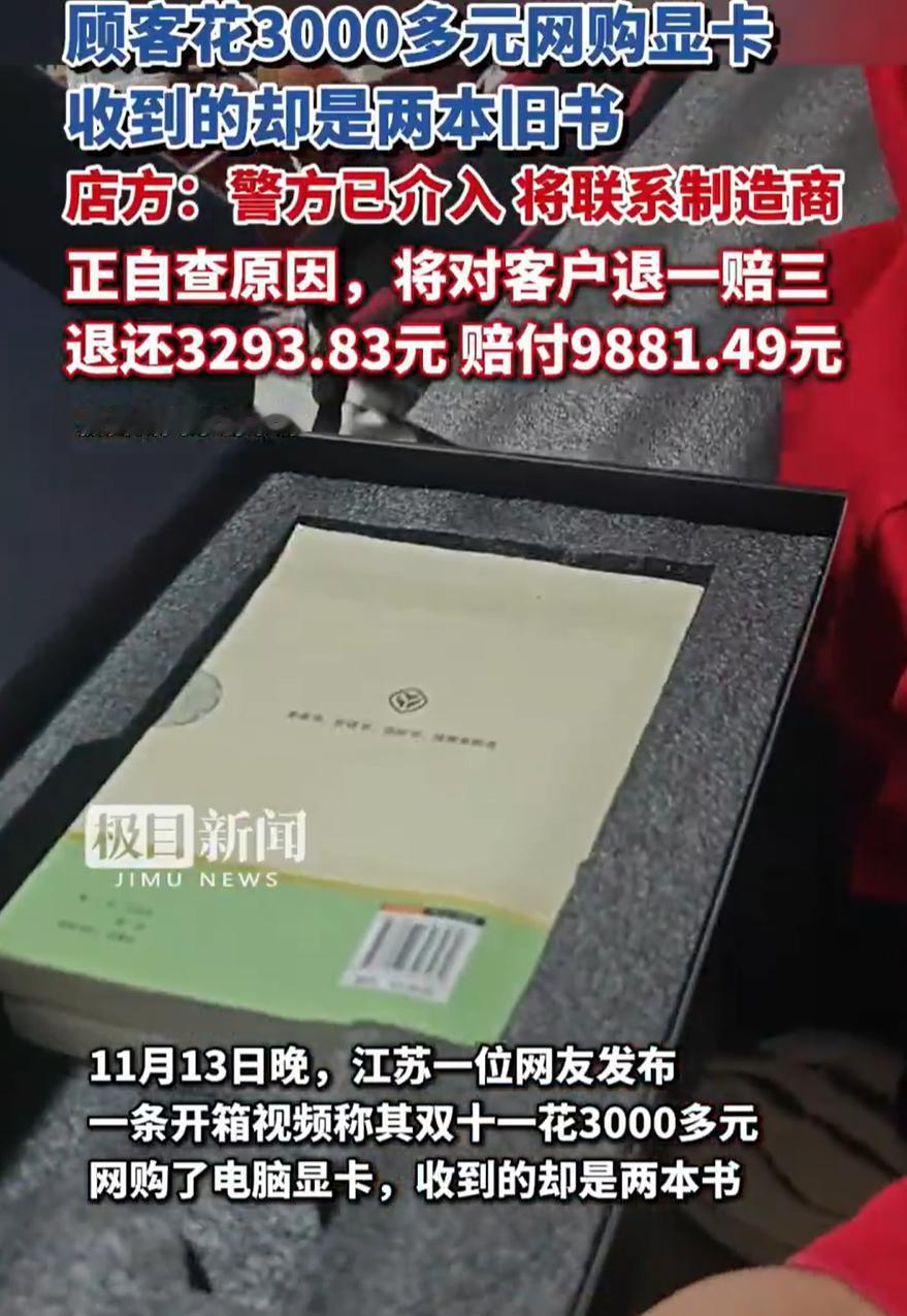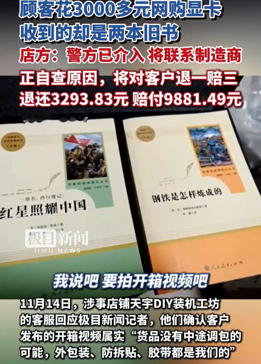 “这下解释不清了!”江苏,男子花3300元在网上买了一个显卡,可拆开快递后,发现里面并不是显卡,而是两本书,一本是《红星照耀中国》,一本是《钢铁是怎样炼成的》,找到商家理论,对方二话不说就退一赔三,可这是怎么回事,他们却不清楚 男子介绍,当时收到快递时,就觉得不太对劲,这个包裹怎么这么沉?于是到家拆箱时,他特意留了个心眼,拍了一个开箱视频,而打开后,里面确实不是电脑显卡 男子找到找到商家,把自己开箱视频发过去,对方承认货品没有中途调包的可能,而且外包装、防拆贴、胶带都是他们的,至于为什么出现这种情况,他们需要自查,愿意对客户退一赔三,即退还3293.83元,另外赔付9881.49元 目前来看,虽然还不清楚具体原因,但有一点还是值得注意,就是在买贵重物品时,消费者保留证据的意识非常重要 正是那段开箱视频,让维权过程变得顺利。同时,这也反映出电商行业在仓储管理、发货流程上可能存在的漏洞。或许是发货环节出错,或许是其他原因,但商家能够主动承担责任,也算是对消费者负责的表现 开箱视频其实已经成为一种叫不上仪式感的小动作,它没啥浪漫,却是现实里最管用的护身符。很多人嘴上嫌麻烦,手上却拍得特别稳,各大平台的纠纷案例看多了,就懂了这种谨慎不是多余