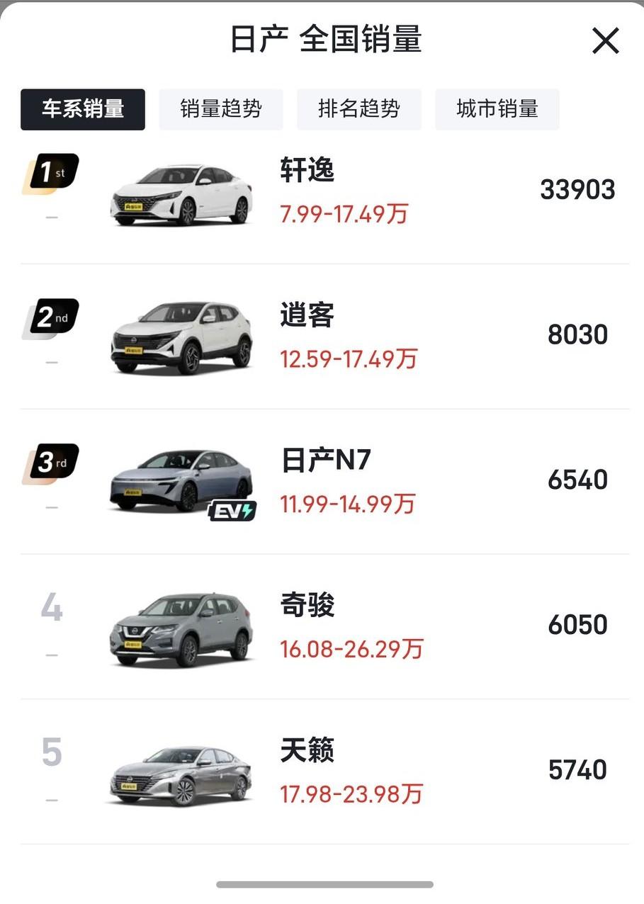 意不意外! 10月,日产轩逸在中国卖了3.39万辆 10月,日产逍客在中国卖了8030辆 10月,纯电车日产N7在中国卖了6540辆 10月,奇骏在中国卖了6050辆 10月,天籁在中国卖了5740辆 10月份,日产在中国总共卖出61007辆,单月销量是2025年最高的,其中有以上5款车销量超过5000辆,纯电车日产N7销量依旧保持不错,不过日产目前还是严重依赖轩逸。 最近,日产N6开始预售,这是东风日产天演架构下首款插混轿车 ,预售权益价10.69万元起,这款车搭载由1.5L自然吸气发动机组成的插混系统,纯电续航180公里,综合续航超过1200公里,百公里亏电油耗仅2.79L。 这款车看着还不错,大家觉得月销量能否破万。