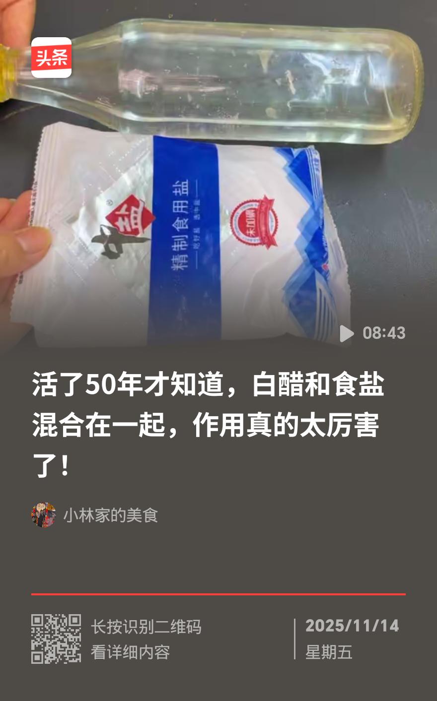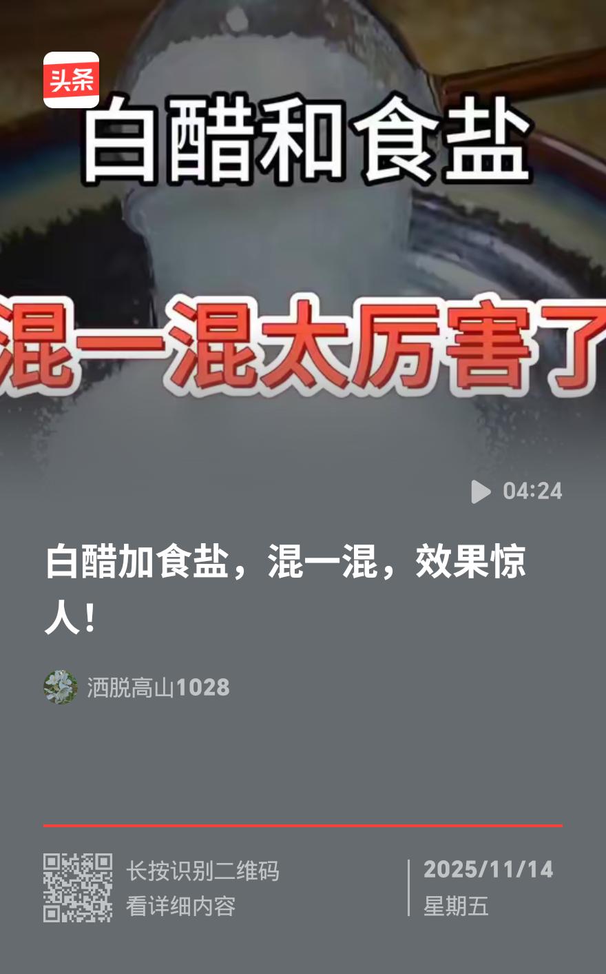 谁能想到!你家厨房随手就能拿到的食盐和白醋,混在一起居然是“清洁神器”?这俩天天见的调味品,威力大到吓人,知道的人没几个,却能轻松搞定一堆家务难题,省钱又省心,再也不用买那些贵巴巴的清洁剂了! 食盐可是“百味之首”,主要成分是氯化钠,除了炒菜调味,杀菌消毒的本事藏得死死的;白醋里有醋酸、乙酸和氨基酸,软化污垢、去异味的能力简直绝了。千万别只把它们当食材,这组合搭配起来,清洁效果直接拉满,做法还简单到离谱! 找个一次性碗,多抓点食盐放进去,倒上白醋,再加点清水,用筷子搅和到食盐全化了就行。把碗的一端捏个小漏水口,往喷壶里倒的时候一点都不会洒,用一次性杯子或者塑料瓶也能弄,操作起来顺风顺水,新手也不会翻车。 菜板天天切肉切菜,纹路里全是残渣,异味越积越重,清水冲一百遍都没用!用调好的溶液均匀喷在菜板上,静置3到5分钟,白醋能把顽固污垢软化,食盐能杀菌消毒,还能顺带把异味带走。之后往洗碗池一冲,菜板立马干干净净,闻着一点怪味都没有,用着也放心。 烧水壶里的水垢是不是特顽固?擦干净没几天又冒出来,看着就闹心!用喷壶把溶液喷在水垢上,拿毛巾一擦,水垢瞬间消失,擦过的地方亮得能反光,堪比新买的!电饭煲锅盖的不锈钢和玻璃部分,油污、污渍粘在上面难清理,喷上溶液轻轻一擦,立马恢复洁净,连缝隙里的残留都能给带出来。 家里没洗洁精的时候,油污盘子是不是让人头大?别慌!把溶液喷在油污上,白醋里的醋酸能跟油脂起反应,直接把油污分解了,食盐还能加速污垢脱落,不用费劲儿搓洗,盘子就能洗得锃亮,一点残留都没有。 冰箱里又脏又有异味?食材放里面都不踏实!用溶液喷在污垢和油脂处,白醋能软化污垢、去掉异味,食盐还能杀菌消毒,拿毛巾轻轻一擦,冰箱内壁立马清爽,食材存放也更安心。窗户轨道里的灰尘堆得厚厚的,喷点溶液一擦就干净,不用费劲抠挖,省时又省力。 卫生间下水道总有异味飘出来?熏得人浑身不自在!往下水道里喷点溶液,或者把整瓶都倒进去泡一会儿,异味会慢慢消失,还能顺带清洁管道,再也不用忍受难闻的味道了。 说真的,生活里的好东西从来不用花钱买!常见的食盐和白醋,搭配起来比专业清洁剂还好用,还没有化学残留,安全又环保。这组“神仙溶液”用法多、操作简单,能解决一堆家务难题,省钱又实用。赶紧在家试试,让家务变得轻松又高效,告别清洁烦恼,把省下来的时间用来歇着不香吗?白醋的奇妙用法 小苏打清洁大法