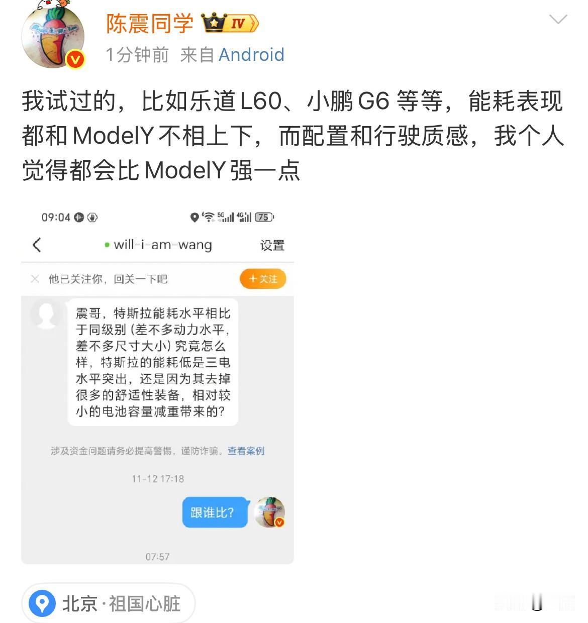 陈震: 乐道L60、小鹏G6 等等,能耗表现都和ModelY不相上下! 就在刚才,有用户专门私信陈震,在他们看来,他们之所以选择特斯拉,就是因为他的三电比较好,而且他的能耗相对来说也比较较低! 对于这位用户的这个看法,陈震认为这几台车他都试过,尤其是尺寸差不多的,而且三电和配置上,也差不多的情况下,他得出的结果是,不管是乐道L60,还是小鹏G6 等系列的车型,他们的综合能耗表现,其实与ModelY不相上下。 甚至他们的行驶质感,开起来给人的反馈,他认为,以上几个品牌,要比特斯拉更舒服一些。 这个结果与很多私信他的用户,结果完全是相反的,因为很多人之所以选择特斯拉,就是认为它简单,三电优秀,开起来也稳定不容易出什么事儿,但是陈震在看法很多普通用户的看法不一样。 而且他还不仅仅只是群里了,我们国产新能源汽车在某一个品牌,而是连续好几个品牌,他认为都要比特斯拉的综合表现优秀稳定,这到底是啥原因。