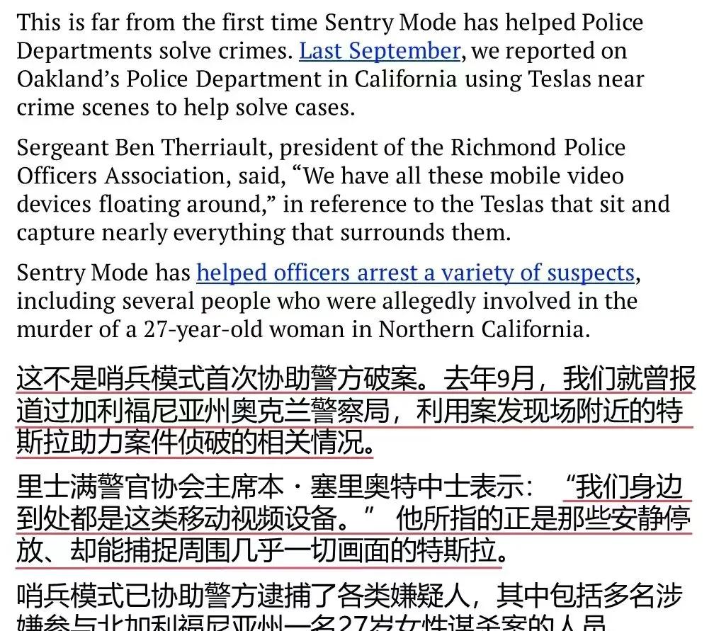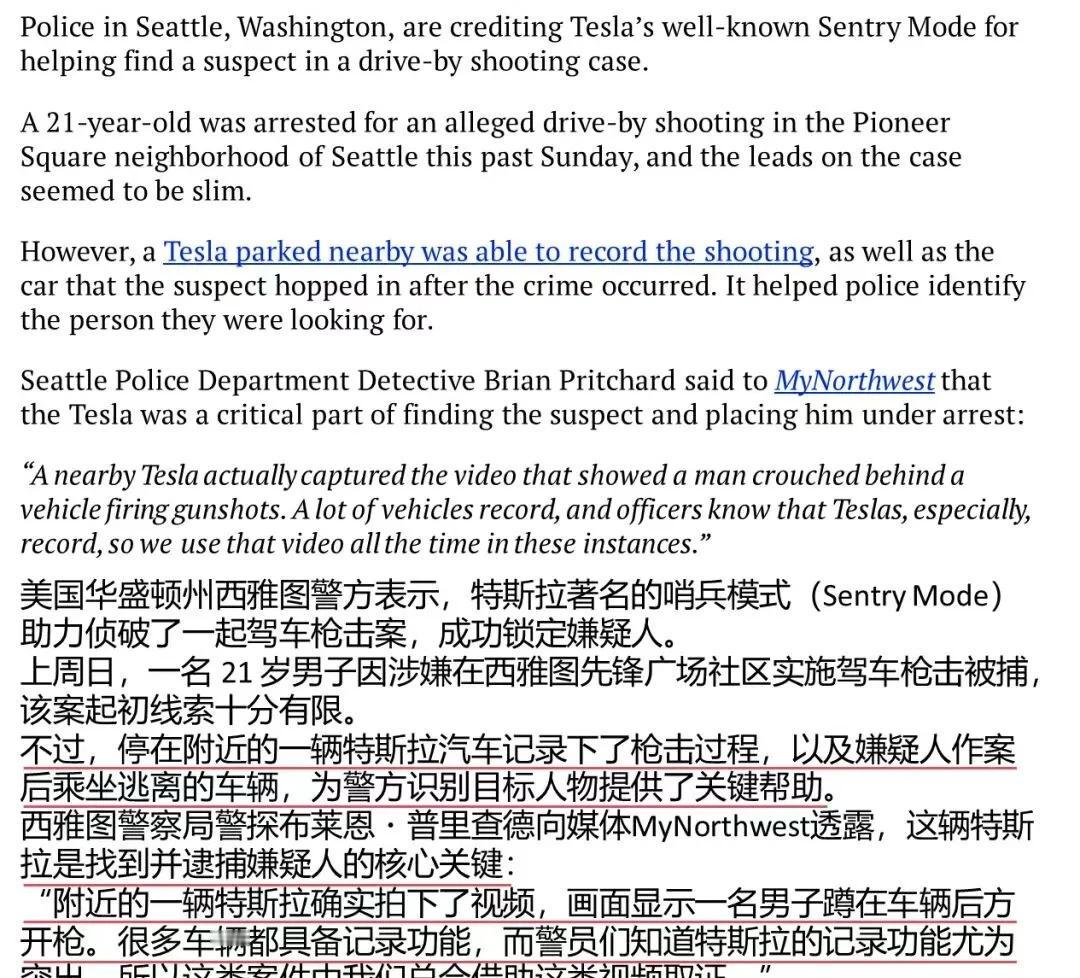 特斯拉哨兵模式再立功:锁定驾车枪击嫌疑人 想象一下,西雅图的街头,夜色笼罩着这座繁忙的城市。突然,一阵刺耳的枪声打破了宁静,一名男子驾驶着车辆,在街巷间肆意开火,留下满地惊恐与混乱。 警方迅速赶到现场,却面临着棘手的难题:目击者寥寥无几,线索如大海捞针,侦破工作一度陷入泥沼。嫌疑人仿佛幽灵般消失在夜色中,案件似乎要成为一桩悬而未决的谜案。 就在这时,一位意外的“目击者”浮出水面——一辆静静停放在事发地附近的特斯拉电动车。它那先进的哨兵模式,像一位不眠的守护者,悄无声息地记录下了整个惊心动魄的过程:嫌疑车辆的轨迹、枪击的瞬间、甚至嫌疑人的面容,都被高清摄像头一丝不苟地捕捉下来。警方通过这些珍贵影像,迅速锁定嫌疑人,并火速将其逮捕。 西雅图警察局的警探不禁感慨:“特斯拉的智能功能在整个案件侦破的过程中发挥了关键作用。” 这并非哨兵模式首次化身为警方的秘密武器。回想去年9月,在加州奥克兰的街头,一起类似犯罪发生时,警方同样面临线索匮乏的困境。 幸运的是,犯罪现场附近一辆特斯拉的录像,成为了转折点,帮助警官们破解谜团。当地警官回忆道:“停放在各处、几乎能完整记录周围场景景象的特斯拉,已经成为我们破案时有力的助手。” 在科技与正义交织的时代,特斯拉的哨兵模式不仅仅是车辆功能,更是城市安全的隐形英雄。Hi这很特斯拉 汽车圈观察者 电动时代的全球经典 特别心动的车 电动汽车