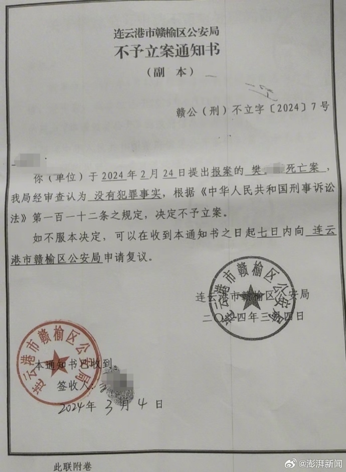 【:赴宴5名镇干部被处理,家属起诉追问死因】 在女儿死亡一年后,樊旭声起诉了公安局,要求公布女儿死因等信息。樊旭声是江苏连云港市赣榆区塔山镇人,他的女儿樊蕊(化名)一年前参加公司老板刘某宴请镇领导的酒局,次日疑似酒精中毒身亡。事发后,死者家属获得两百多万元赔偿。当日违规参加宴请的镇党委书记、镇长等4名干部受到纪律处分。赣榆区公安局对樊蕊之死进行调查后认为没有犯罪事实,决定不予立案。出事那天是2024年2月24日,元宵节。当天上午11点多,接到警方通知的樊旭声赶到派出所,然后坐警车去了赣榆区殡仪馆,现场已有警察及两名法医。在停尸间,樊旭声看到了女儿樊蕊的尸体。“头部没有受伤,身上也没有伤痕,就是肚脐以下有些青紫。”樊旭声回忆,他当时强忍悲痛地询问法医,得知其女儿的死因跟酒精中毒有关,“法医说是喝酒过多造成的”。但他仍存疑虑,当日就提出了尸检的要求。樊旭声称,事发数日后,在赣榆区公安局塔山派出所,再次提出了尸检要求,而对方告诉他,已经检验了樊蕊体内的提取物,发现其中含有刘某的精液。当晚的酒宴结束后,还发生了什么?根据相关信息,在事发当晚的酒宴结束后,昌隆公司的两名女职工前来照顾樊蕊。公司老板刘某安排她们将樊蕊扶到他的办公室。昌隆公司的食堂、员工宿舍和老板办公室,都在同一栋的研发楼。樊蕊的宿舍位于三楼,刘某的办公室在一楼。刘某的办公室是一个套间,里面还有他的卧室。按照刘某的安排,两名女员工将樊蕊扶到他办公室后就走了。后来,刘某把樊蕊扶进办公室里面的卧室……据后来警方调查,当天夜里,刘某与樊某发生了性关系。第二天早上醒来,刘某发现一旁的樊蕊没有了呼吸。他赶紧打电话报警,并向镇领导汇报。赣榆区公安局刑警大队的《受案登记表》记载,接到报案的时间是2024年2月24日9点16分,报警人为刘某。警方当日迅速开展初查。当年3月4日,赣榆区公安局出具《不予立案通知书》,“我局经审查认为没有犯罪事实”,决定不予立案。2025年10月,赣榆区纪委工作人员答复举报人:警方调查后发现,刘某与樊蕊系情人关系。几个月后,樊旭声不断听到关于女儿死亡的传言。后来向上级部门反映时,樊旭声将其听到的“死者体内有男人的体液”,写进了书面材料中。据樊旭声称,他曾多次向警方提出,要求查看昌隆公司和塔山镇政府在事发当日的监控视频,被告知“监控设备有故障”。樊旭声越来越觉得女儿的死因可疑。“一般的事我可以谅解,”他说:“但如果这是刑事案件,我是要追究到底的。” (澎湃新闻)