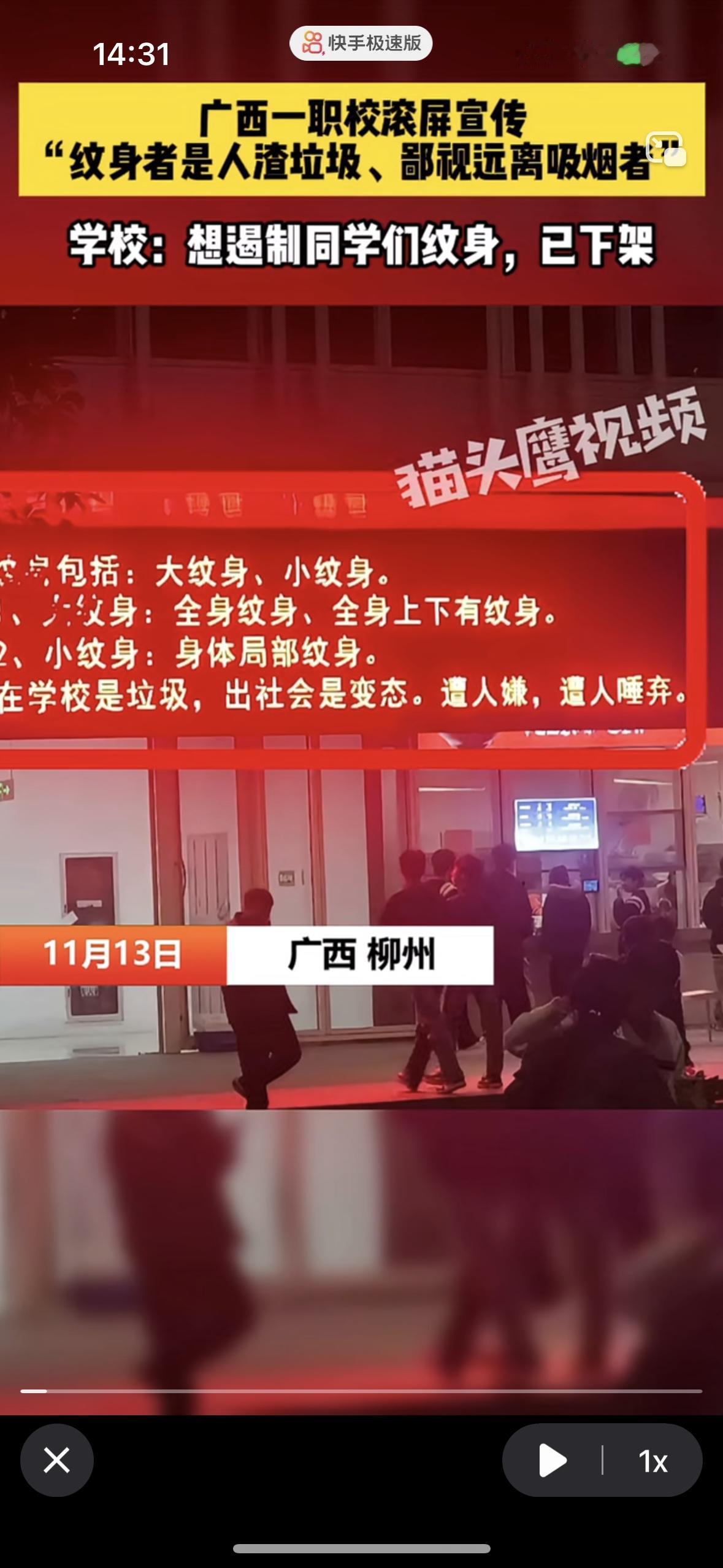 纹身者都是垃圾!出社会就是变态 你能想象吗?这居然是学校的滚屏宣传 都说学校是最不歧视人的地方,让孩子最纯真善良 没想到职业学校也会这么歧视人,鄙视吸烟的人,歧视有纹身的人!说有纹身的人就是坏人,是潜在的犯罪嫌疑人,难道有纹身就一定有案底吗?我觉得这么说话太绝对了!毕竟有些有纹身的人只是个人爱好,可以教育孩子们不要纹身,但有必要这样歧视吗?!