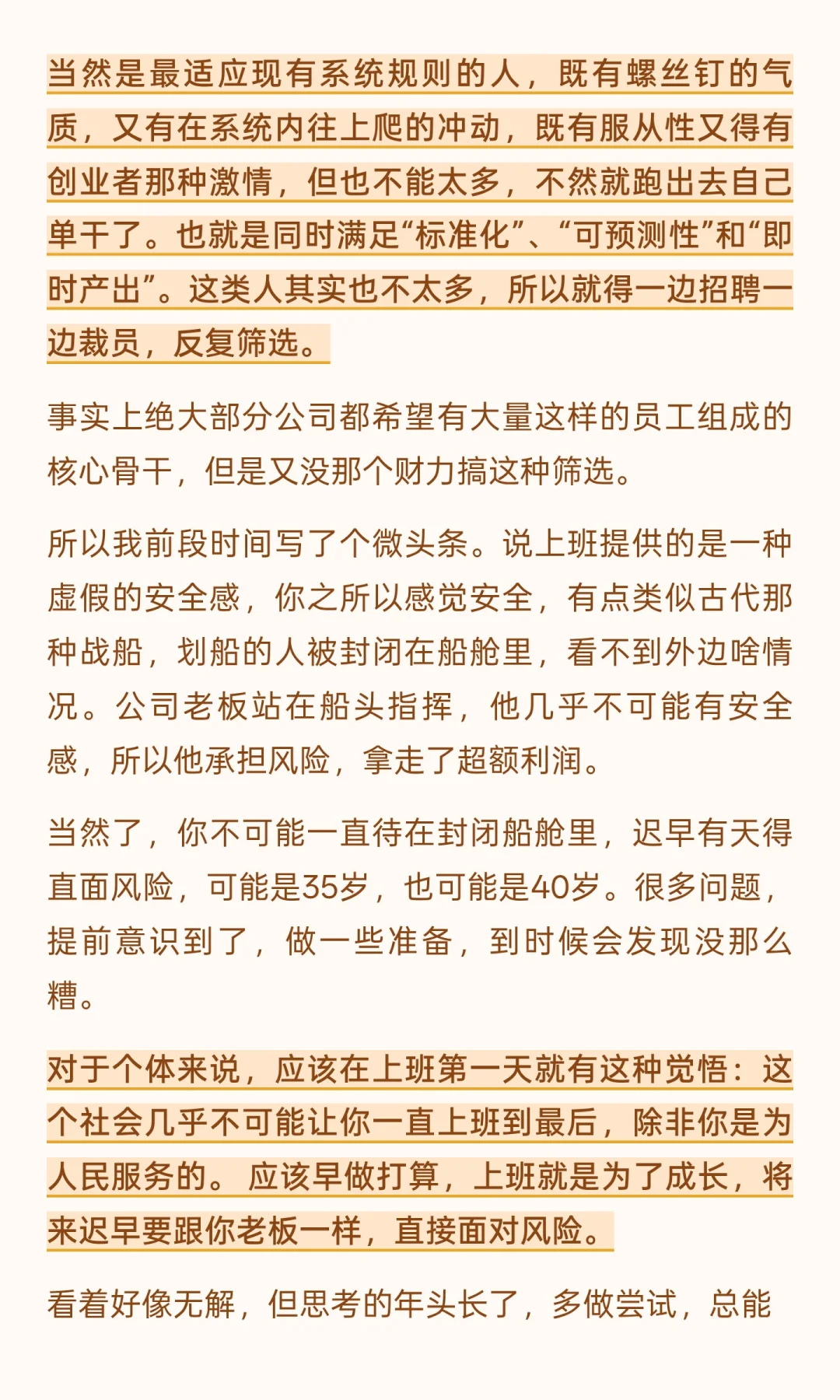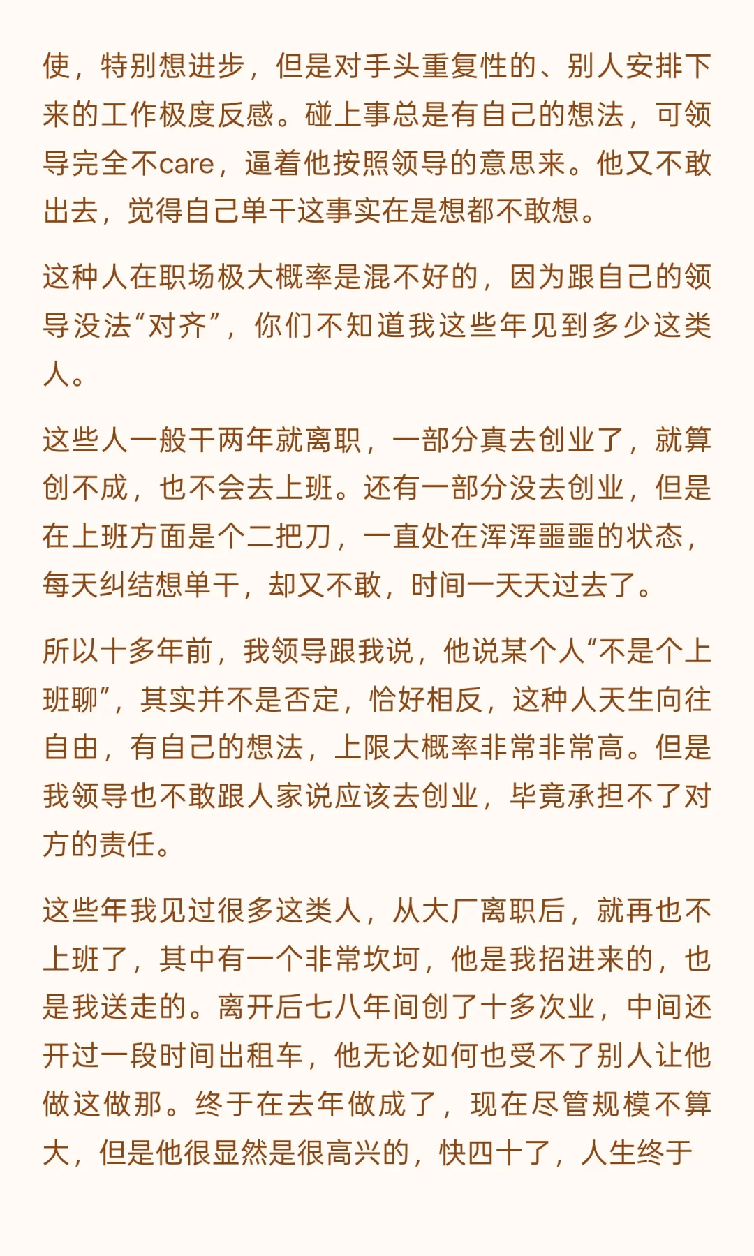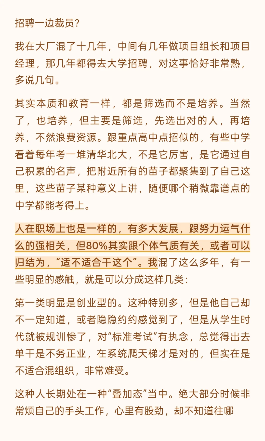 职场筛选出适合的人并不多,大多数人不适合长期上班。 创业型、文艺青年和纯混子分别适合不同岗位,但多数人最终会面临单干或被裁员。 职场提供虚假安全感,但迟早要直面风险。调整心态,多尝试,找到适合自己的生活方式。 对于个体来说,应该在上班第一天就有这种觉悟:这个社会几乎不可能让你一直上班到最后,除非你是为人民服务的。 应该早做打算,上班就是为了成长,将来迟早要跟你老板一样,直接面对风险。 人在职场上也是一样的,有多大发展,跟努力运气什么的强相关,但80%其实跟个体气质有关,或者可以归结为,“适不适合干这个”。 说到这里,问题来了,大厂到底要的是啥样的人?当然是最适应现有系统规则的人,既有螺丝钉的气质,又有在系统内往上爬的冲动,既有服从性又得有创业者那种激情,但也不能太多,不然就跑出去自己单干了。也就是同时满足“标准化”、“可预测性”和“即时产出”。这类人其实也不太多,所以就得一边招聘一边裁员,反复筛选。