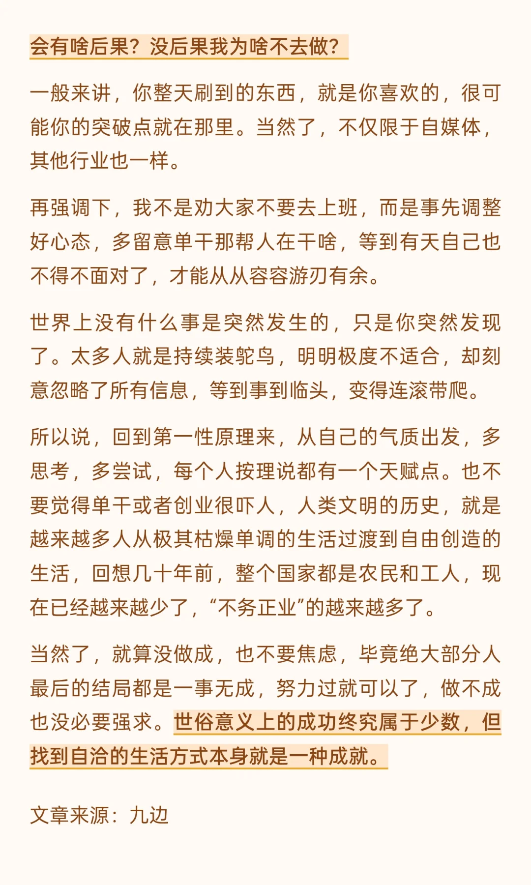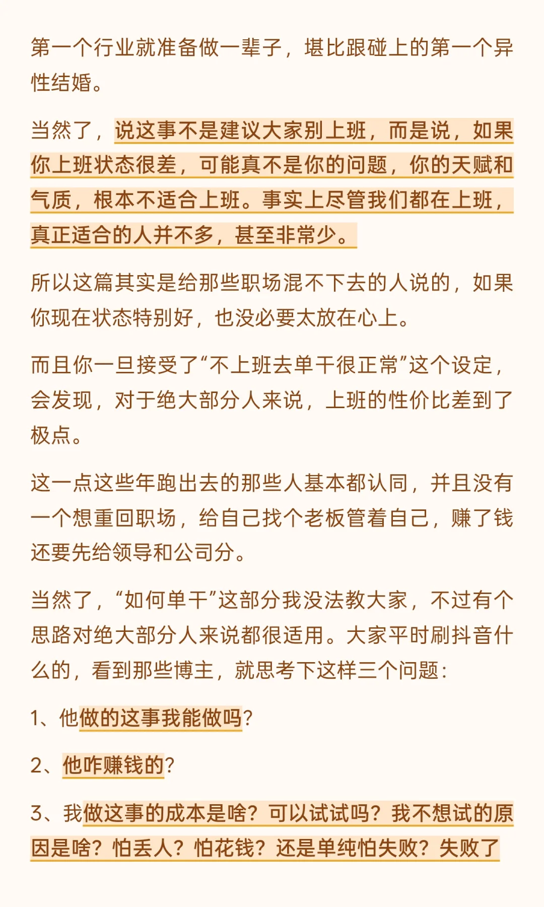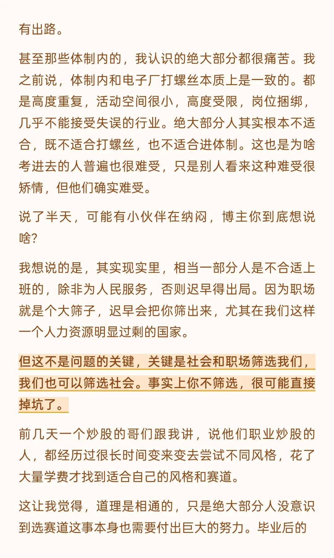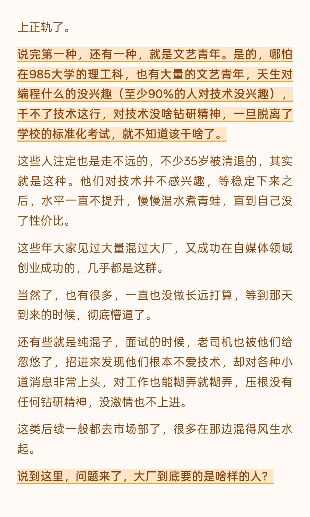 职场筛选出适合的人并不多,大多数人不适合长期上班。 创业型、文艺青年和纯混子分别适合不同岗位,但多数人最终会面临单干或被裁员。 职场提供虚假安全感,但迟早要直面风险。调整心态,多尝试,找到适合自己的生活方式。 对于个体来说,应该在上班第一天就有这种觉悟:这个社会几乎不可能让你一直上班到最后,除非你是为人民服务的。 应该早做打算,上班就是为了成长,将来迟早要跟你老板一样,直接面对风险。 人在职场上也是一样的,有多大发展,跟努力运气什么的强相关,但80%其实跟个体气质有关,或者可以归结为,“适不适合干这个”。 说到这里,问题来了,大厂到底要的是啥样的人?当然是最适应现有系统规则的人,既有螺丝钉的气质,又有在系统内往上爬的冲动,既有服从性又得有创业者那种激情,但也不能太多,不然就跑出去自己单干了。也就是同时满足“标准化”、“可预测性”和“即时产出”。这类人其实也不太多,所以就得一边招聘一边裁员,反复筛选。