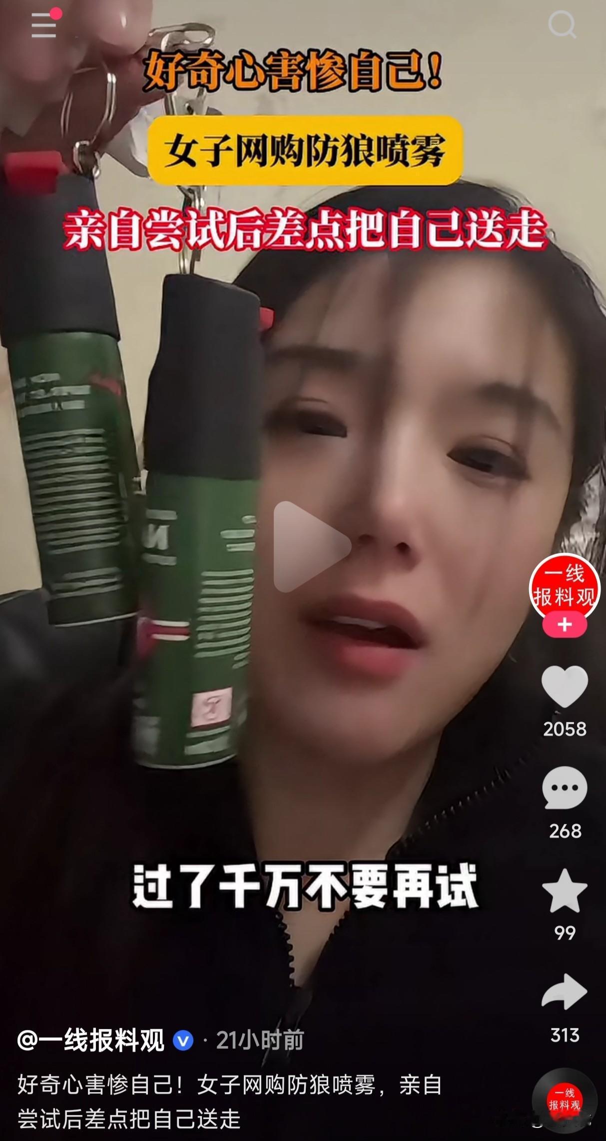 好奇心害死猫,女子好奇心太重害惨自己,她网购防狼喷雾,亲自尝试后差点把自己送走,然后录视频告诫网友千万不要试,她已经替大家试过了,太辣眼睛了。 这防狼喷雾的效果这么好吗?防狼喷雾是用来防色狼的还是用来防坏人的?如果经常走夜路的女生买来以备不时之需还可以,遇到坏人或者图谋不轨的人,那效果肯定会让人大吃一惊。 好奇心人人都有,但有些事情还是不要过于好奇,好奇过头万一把自己送走就得不偿失了不是吗?