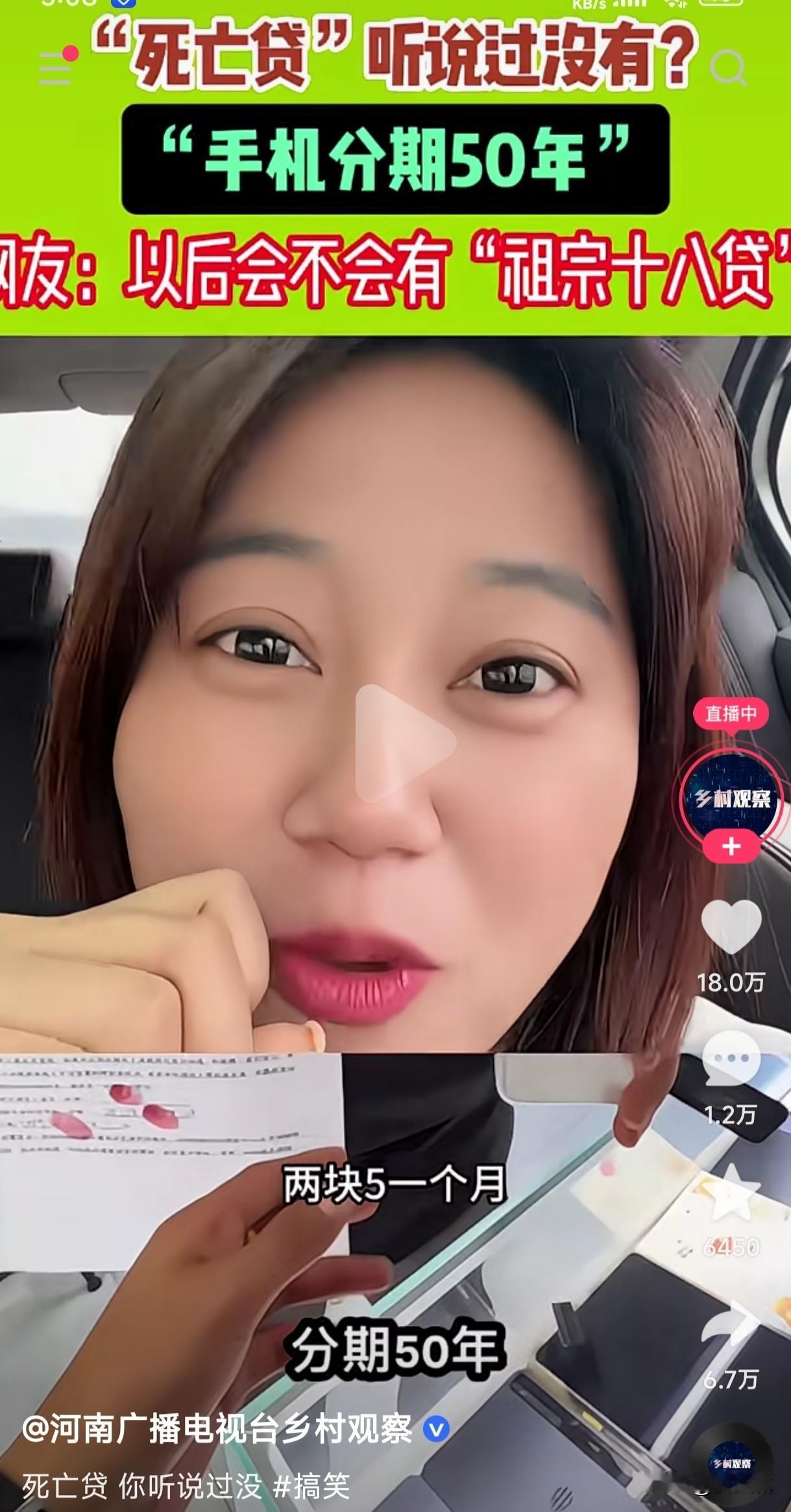 第一次听说死亡贷,你听说过死亡贷吗? 小伙买了一个手机,分期50年,一个月还2块5,老板说如果小伙死了就让他媳妇还,媳妇如果没了就让他儿子女儿还,这就是意味着小伙没了都要还。 这哪里是死亡贷,这分明是一贷要三代还吗?这样的死亡贷真的划算贷吗?一个手机分期50年,这个手机又能用几年,就贷款要50年才能还清,50年时间不知用坏了多少手机?这个贷款分期50年,那手机能用50年吗?