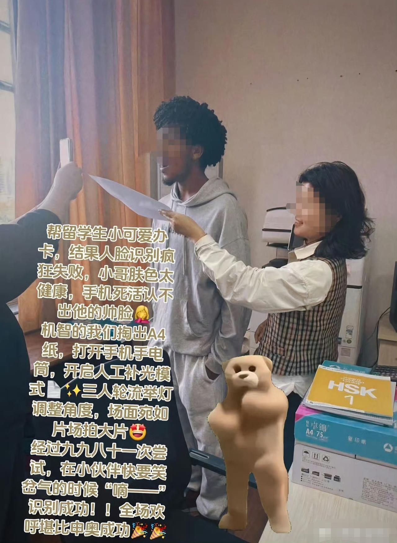 武汉某大学,黑人留学生办卡人脸识别失败,几个人轮流举手机电筒补光,最终识别成功, 全场欢呼堪比申奥成功!