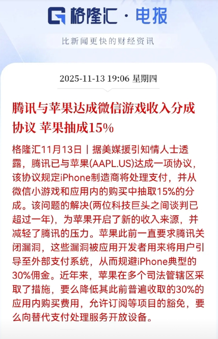 腾讯和苹果这两个大佬,一个管着微信里海量的小游戏,一个管着iPhone大门的钥匙,现在终于谈妥了,怎么分摊游戏里赚的钱!