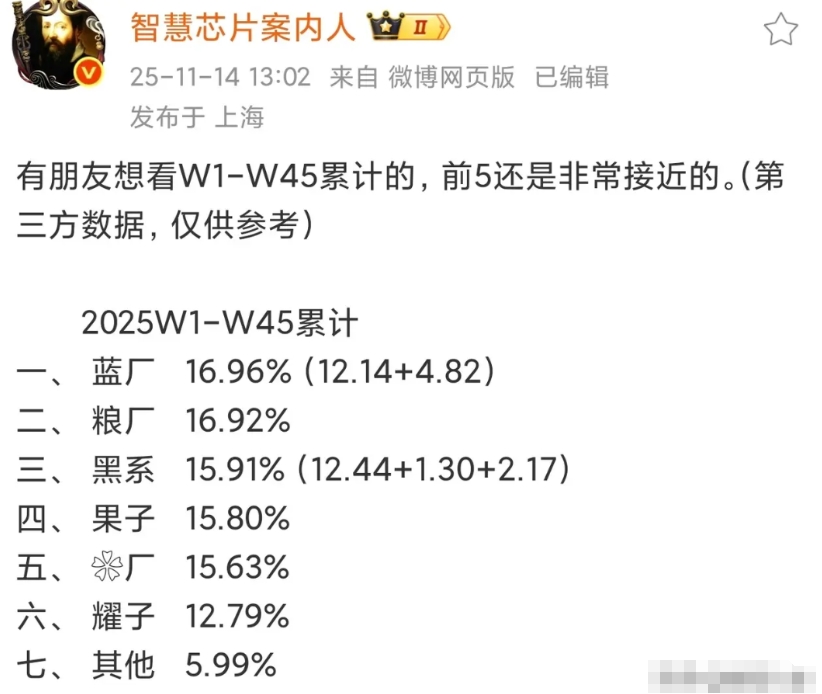 国内手机市场W1-W45累计销量排名出来了,vivo第一、小米第二…… 刚刚,博主透露了截至第45周,国产手机市场的销售情况,从整体看,销售前五的品牌份额相差不大,可以看出竞争很激烈,而苹果果iPhone 17系列的热销,也是填平了此前销量不佳的情况。