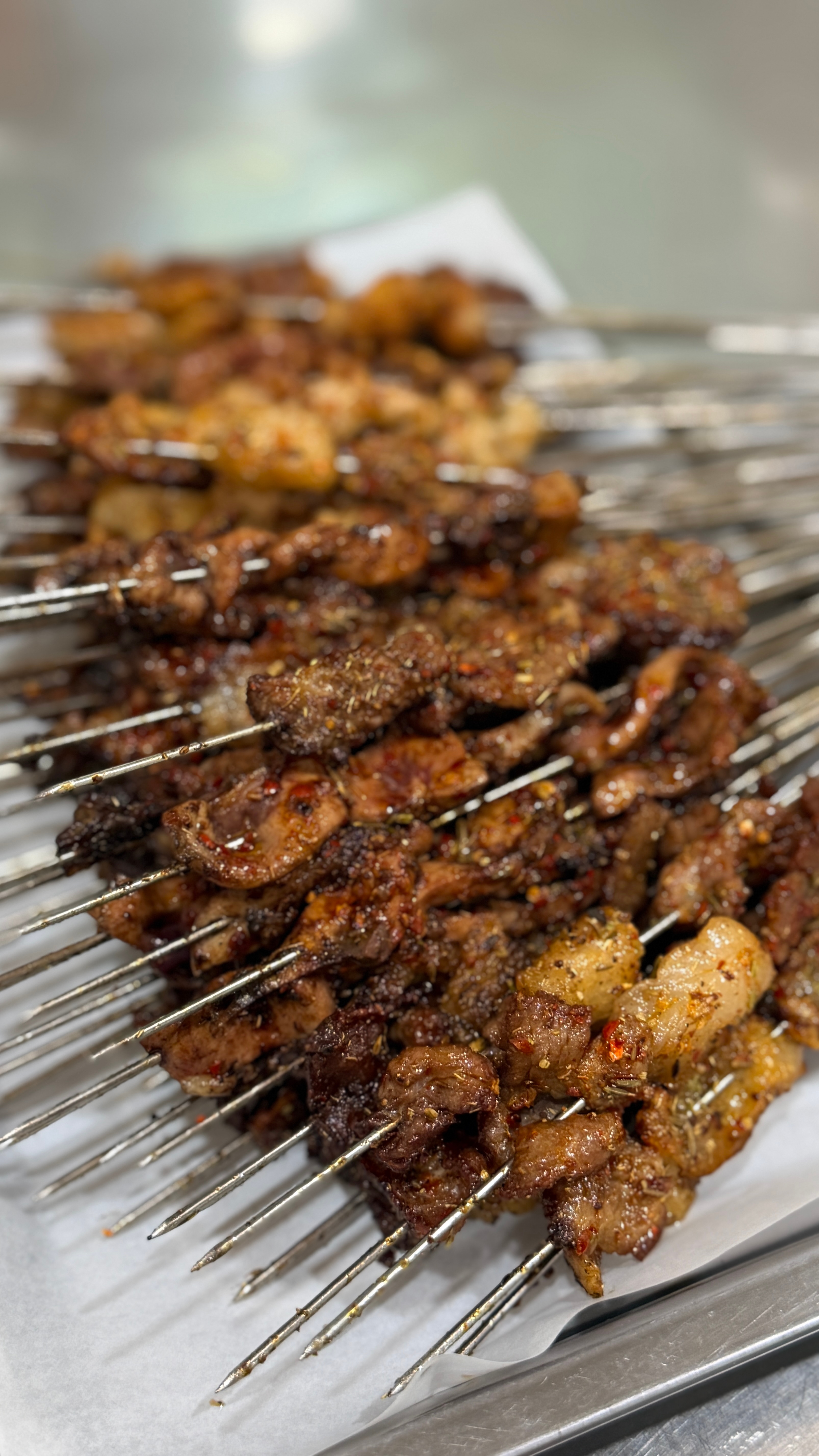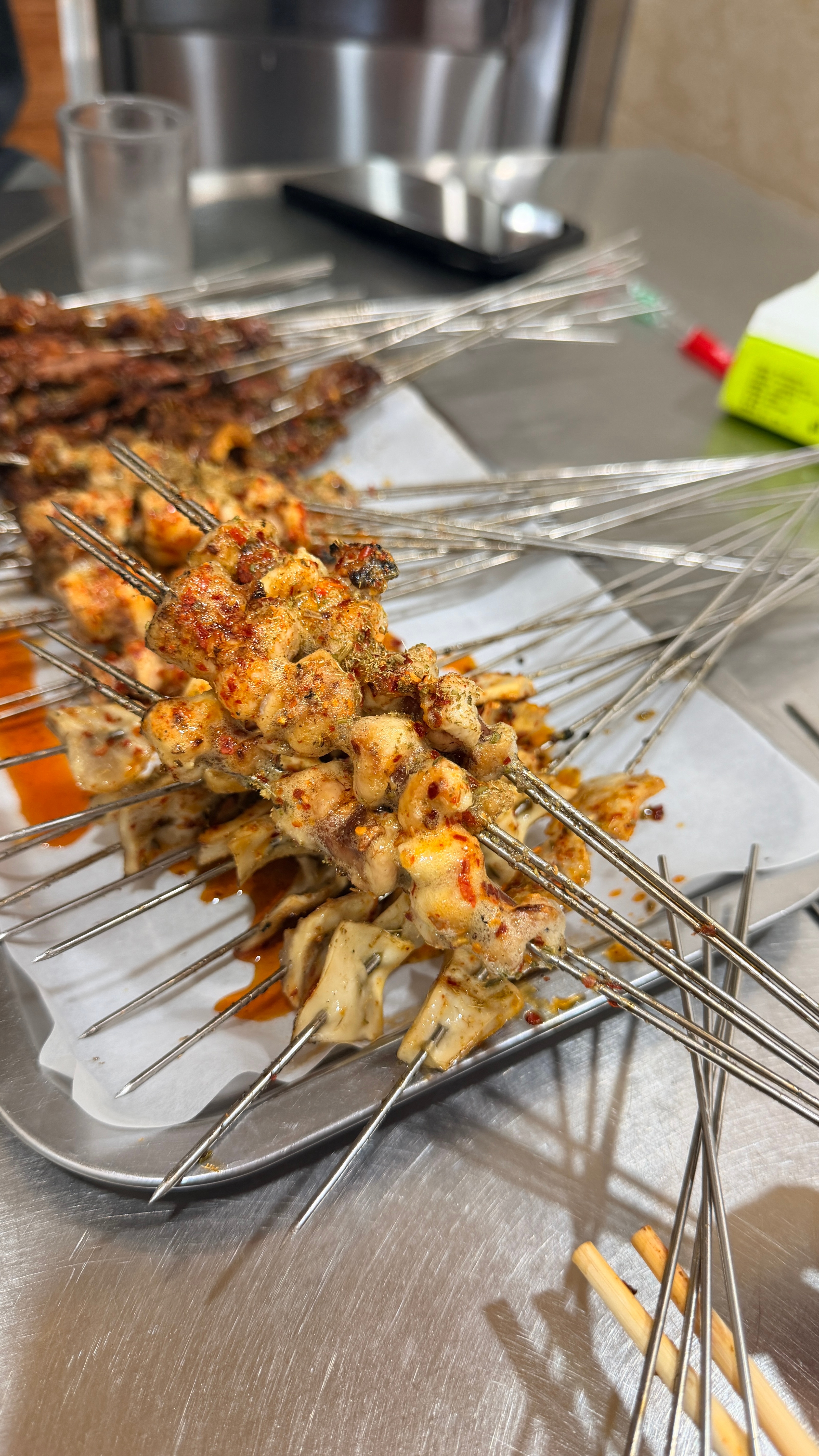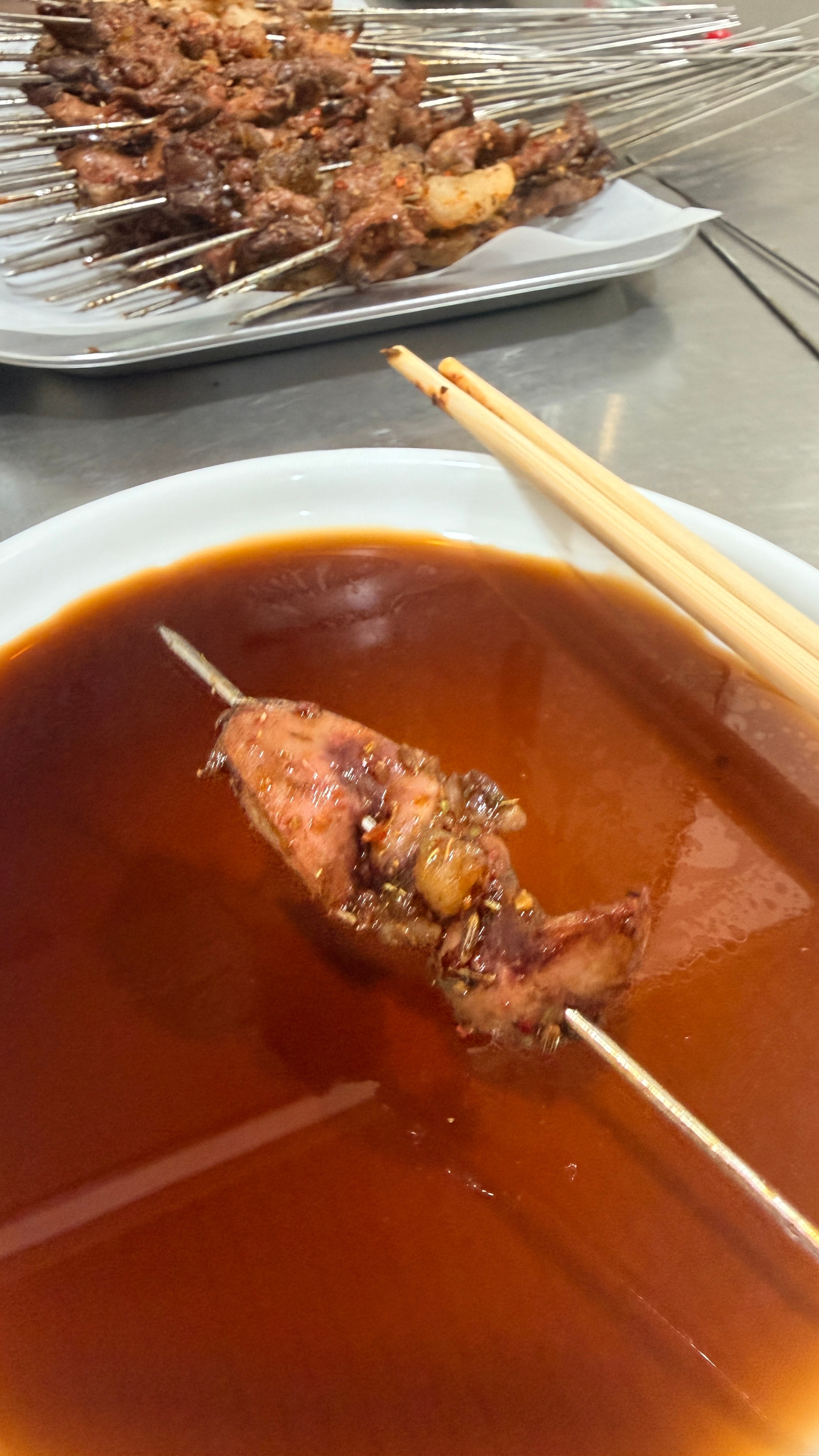 说到东北烧烤,那简直是用炭火与孜然写下的烟火人间中最地道的诗。我今天来的这家据说是当地最地道的烧烤,从长春驱车1个多小时,来到德惠已经是中午饭点,这里不出意外的座无虚席正在加桌。这家烧烤店全是图2这种小串,每一口都特别入味!我好恨微博不能把味道传送给你们,就大概形容一下口感吧最惊艳的骨髓小串,端上桌时,看似朴实无华,可一旦凑近火源,骨髓开始“咕嘟”冒泡,油脂被逼出,滴落在炭上,“刺啦”一声,炸开一团勾魂的香雾。趁热入口,不是用牙啃,而是用嘴嗦——轻轻一吸,那一整条滑腻丰腴的髓肉,脂膏香腻,还有周边筋皮上的调料香,直接被惊艳!然后就是胸口油,我想叫它:勇者的黄金脆片,会爆汁的奶香炸弹没吃过的人会觉得这分明是一串串油汪汪的肥肉。但经常吃的才知道,这是考验烧烤功力,外层是意想不到的酥脆,像一层薄薄的焦糖壳,“噗嗤”一声,一股温热的、带着浓郁奶香的牛油汁水在口中炸开,天啊写到这我又开始流口水了!这次还吃到了一个之前从没吃过的:烤牛燕翅。我查了一下,这是牛肩胛骨内侧一块藏得很深的“活肉”,带着一层晶莹的肉筋,因纹理好像羽翼而得名,别看貌不惊人,但真是内力深厚!有肉的嫩、筋的弹和软骨的脆,蘸点盘子里的醋,一口撸到嘴里,每嚼一下,都有不同的口感和肉香涌出,这时候在就一口蒜,我直接香的摇头晃脑开始哼歌了!“急头白脸”吃一顿,两个人吃了120串,依然狠自己不能再多吃几串了,在东北,你说各种花式料理可能我们不擅长,但是要说烧烤,那我敢打包票东北人个顶个都是BBQ料理专家!同样的食材、调料,就是能烤出全国独有的唇齿留香。“大金链子小手表,一天三顿小烧烤”既是东北人的松弛状态,也是快乐哲学。对于生长在黑土地上的人们来说,这又何尝不是是粗犷、直接、又让人欲罢不能的江湖诗意。