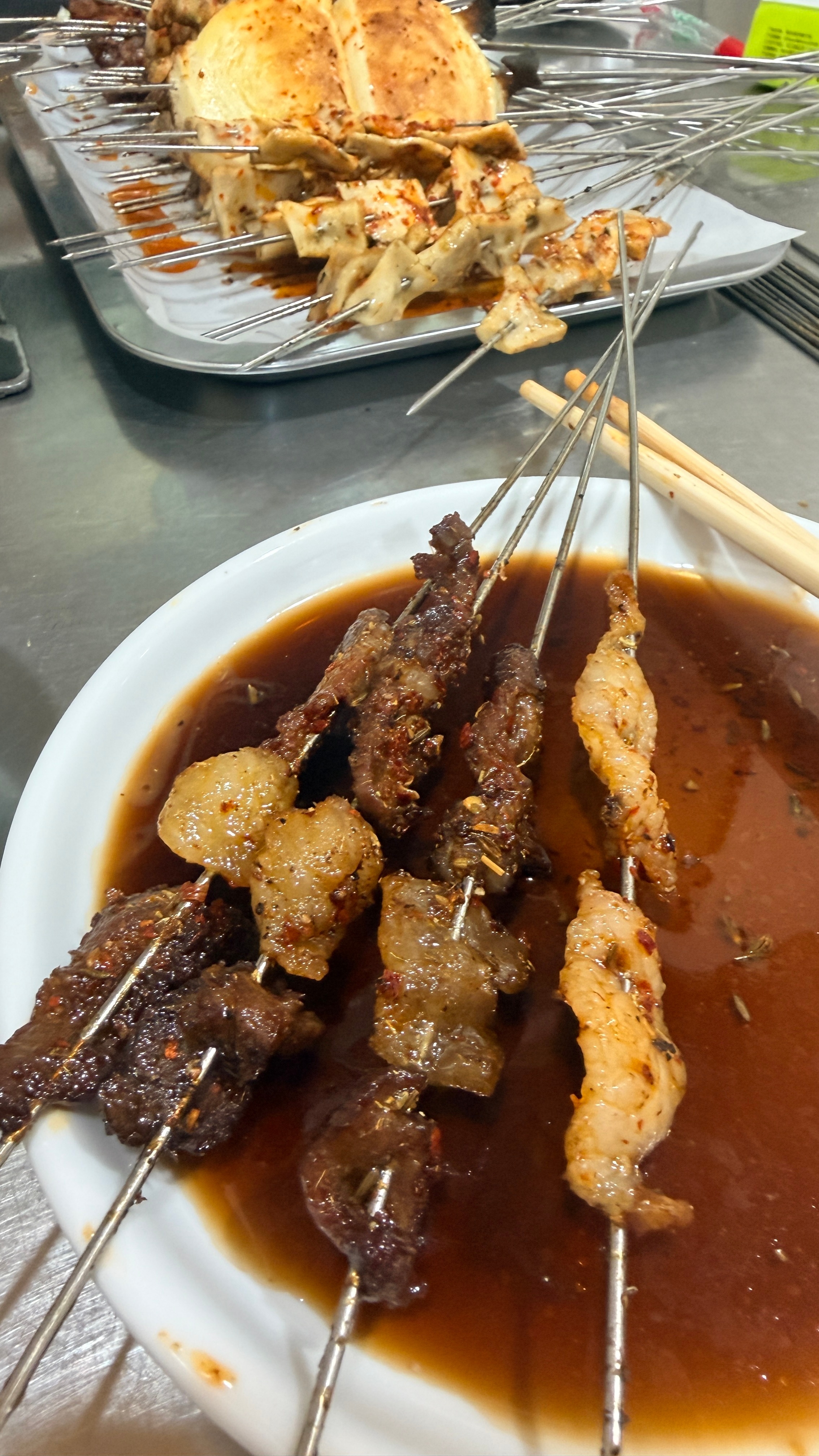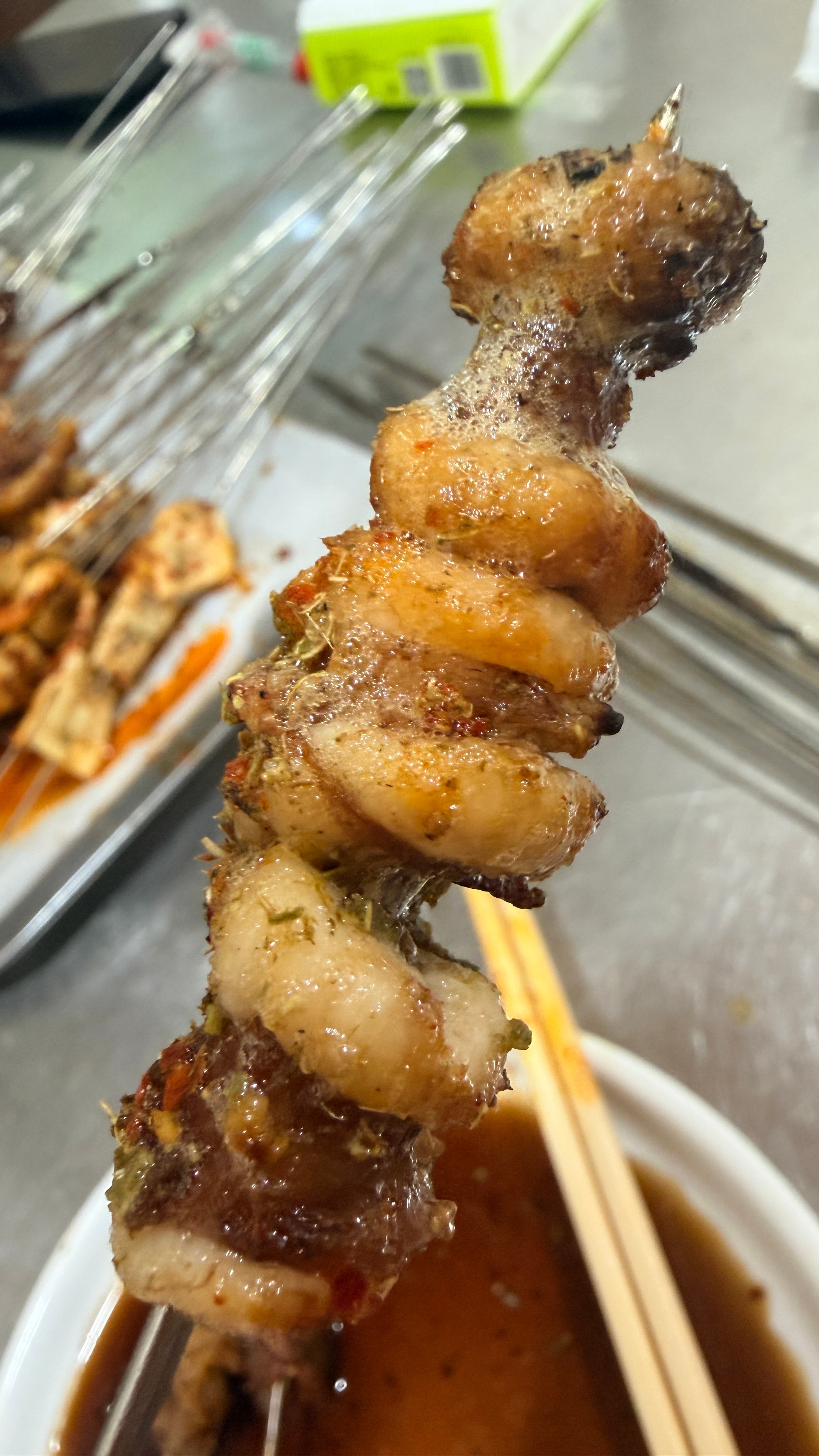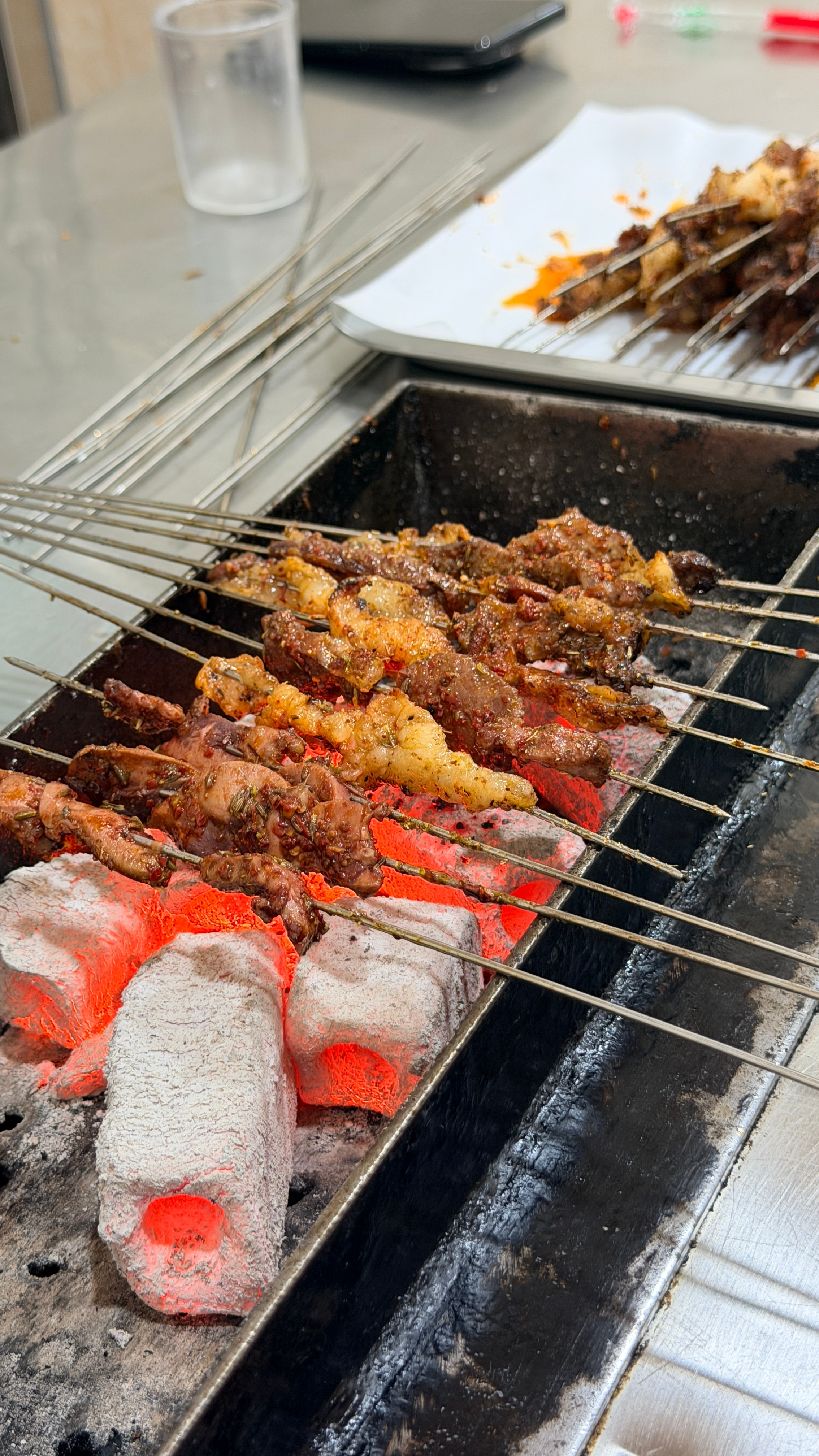 说到东北烧烤,那简直是用炭火与孜然写下的烟火人间中最地道的诗。我今天来的这家据说是当地最地道的烧烤,从长春驱车1个多小时,来到德惠已经是中午饭点,这里不出意外的座无虚席正在加桌。这家烧烤店全是图2这种小串,每一口都特别入味!我好恨微博不能把味道传送给你们,就大概形容一下口感吧最惊艳的骨髓小串,端上桌时,看似朴实无华,可一旦凑近火源,骨髓开始“咕嘟”冒泡,油脂被逼出,滴落在炭上,“刺啦”一声,炸开一团勾魂的香雾。趁热入口,不是用牙啃,而是用嘴嗦——轻轻一吸,那一整条滑腻丰腴的髓肉,脂膏香腻,还有周边筋皮上的调料香,直接被惊艳!然后就是胸口油,我想叫它:勇者的黄金脆片,会爆汁的奶香炸弹没吃过的人会觉得这分明是一串串油汪汪的肥肉。但经常吃的才知道,这是考验烧烤功力,外层是意想不到的酥脆,像一层薄薄的焦糖壳,“噗嗤”一声,一股温热的、带着浓郁奶香的牛油汁水在口中炸开,天啊写到这我又开始流口水了!这次还吃到了一个之前从没吃过的:烤牛燕翅。我查了一下,这是牛肩胛骨内侧一块藏得很深的“活肉”,带着一层晶莹的肉筋,因纹理好像羽翼而得名,别看貌不惊人,但真是内力深厚!有肉的嫩、筋的弹和软骨的脆,蘸点盘子里的醋,一口撸到嘴里,每嚼一下,都有不同的口感和肉香涌出,这时候在就一口蒜,我直接香的摇头晃脑开始哼歌了!“急头白脸”吃一顿,两个人吃了120串,依然狠自己不能再多吃几串了,在东北,你说各种花式料理可能我们不擅长,但是要说烧烤,那我敢打包票东北人个顶个都是BBQ料理专家!同样的食材、调料,就是能烤出全国独有的唇齿留香。“大金链子小手表,一天三顿小烧烤”既是东北人的松弛状态,也是快乐哲学。对于生长在黑土地上的人们来说,这又何尝不是是粗犷、直接、又让人欲罢不能的江湖诗意。
