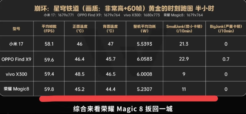 不得不说今年的旗舰机在散热上都用料太猛了,这四款手机散热面积最大的是荣耀Magic8了。在游戏的测试环节,也是荣耀Magic8的平均帧率最高,发热也控制的很不错。 大家在买手机的时候会考虑性能和散热吗?
