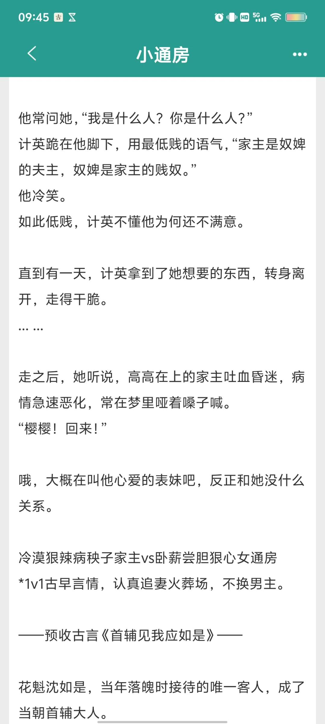 《小通房》 作者:法采 20年完结的文,一共108章 狠心通房vs冷漠家主 追妻火葬场,比较虐女,介意的不要看容易上火,没看完,因为被气到了,男主太爱骂人。