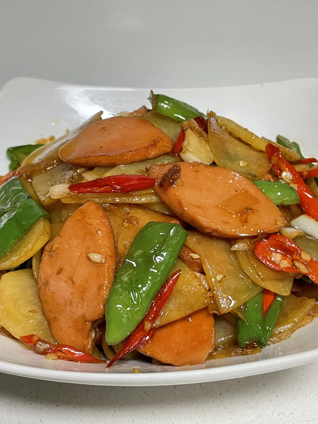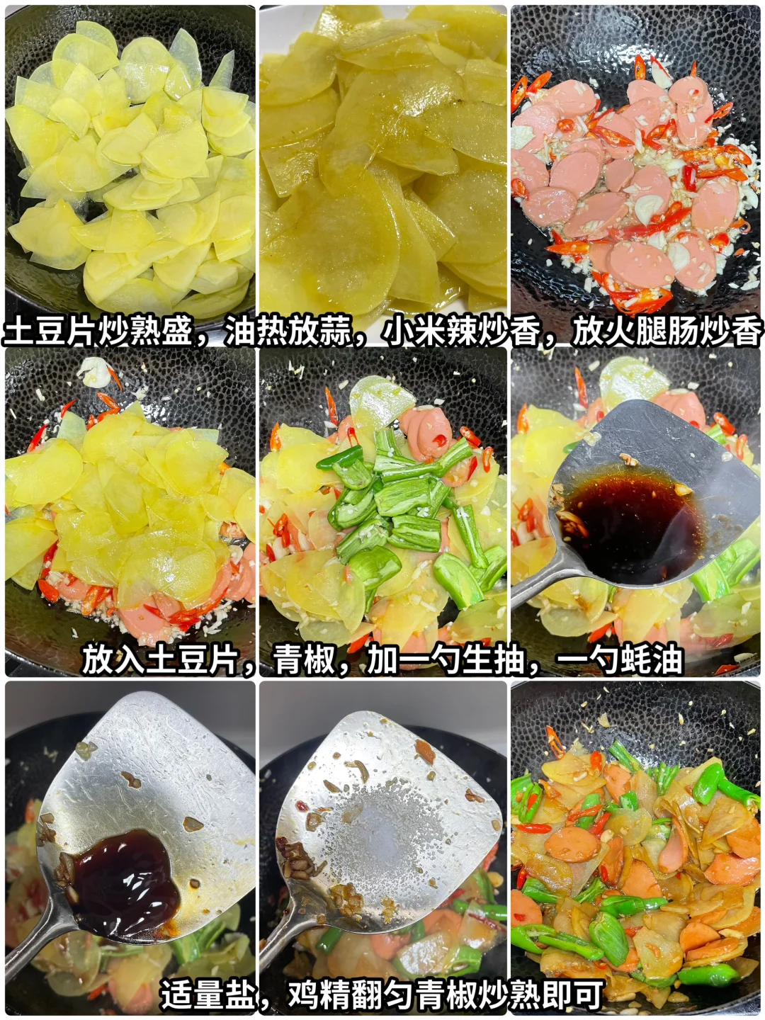 2⃣️起锅少油,油热,将土豆片炒断生盛出,再放油,油热将蒜和小米辣炒香,放入火腿肠炒熟,加入土豆片和青椒,放1勺生抽,1勺蚝油,适量的盐和鸡精,将青椒炒断生即可出锅。