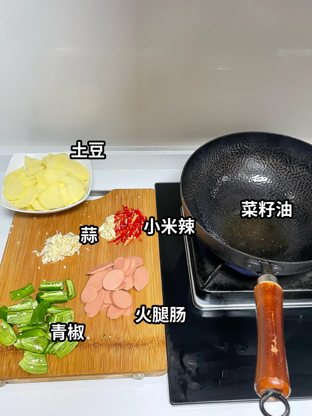 1⃣️土豆切片,火腿肠切片,青椒切块,准备多一点的蒜末,一小点蒜片,一点小米辣,切碎备用。