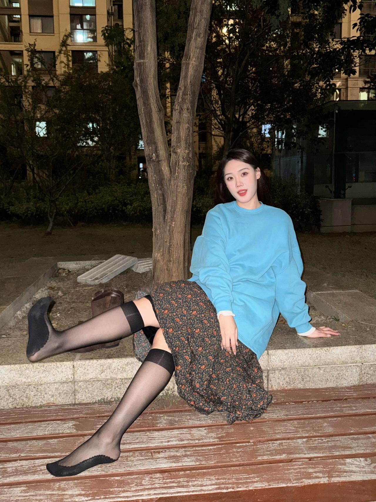 夜晚的街头,少女倚栏而立,灯光下的迷人侧颜