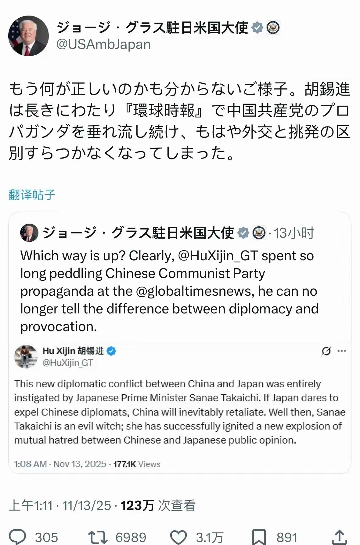 胡锡进被美国驻日大使骂了。胡锡进形容高市早苗为“an evil witch(一个恶毒的巫婆)”,美国驻日大使乔治•格拉斯窜出来了,斥责“胡锡进分不清外交与挑衅”。这回,胡锡进本来是坐得很端正,对高市早苗的涉台错误言论进行了连番批驳,还给她起了一个外号,大受中国网友赞赏。却没想到,他犯了一个大忌,也就是打狗没看主人,惹得格拉斯冒出头来,横加指责了一番。格拉斯是不是有点拦偏架啊?哦,对了,忘了那是他家养的了!