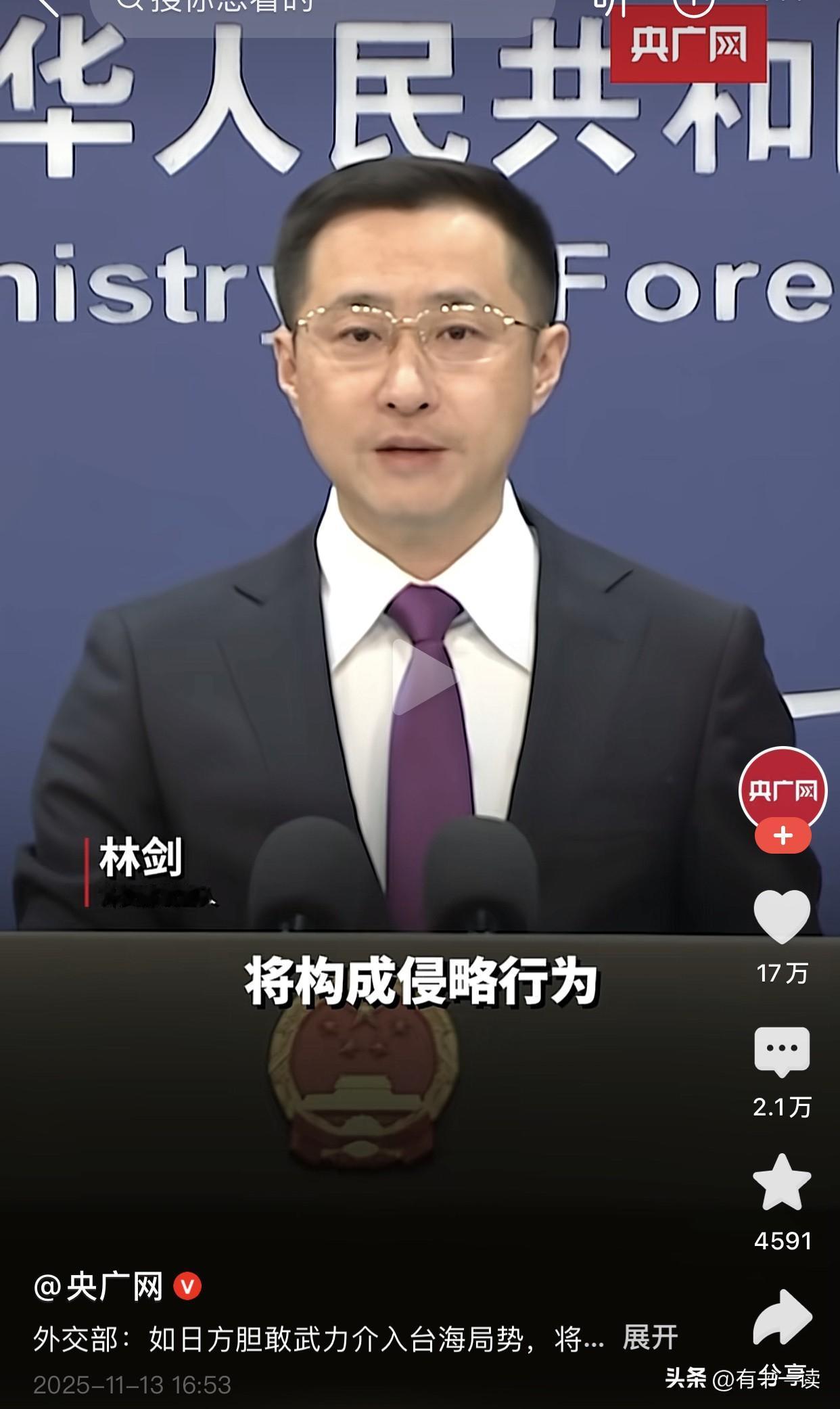 都给我去看昨天的新闻联播和外交部发布会!中方直接亮明红线:日本胆敢武力介入台海,就是赤裸裸的侵略! 迎头痛击不是空话, 是刻在骨子里的警告。 台湾是中国的家事, 轮不到域外跳梁小丑指手画脚! 侵略的定义,中方替你划死! 动台海=开战火,没有模糊地带! 外交部发言人掷地有声的定性, 撕碎了日本想打“擦边球”的幻想。 别以为换个“自卫”马甲就能掩人耳目, 1874年出兵台湾、 1895年强占宝岛、 1931年九一八事变, 哪次不是打着“合理”旗号 干着侵略勾当? 我们不想打仗,但绝不怕打仗, 解放军的舰机、手中的正义, 就是捍卫主权的最强底气! 今日中国, 早有实力让侵略图谋碎成齑粉! 台海局势 台海问题