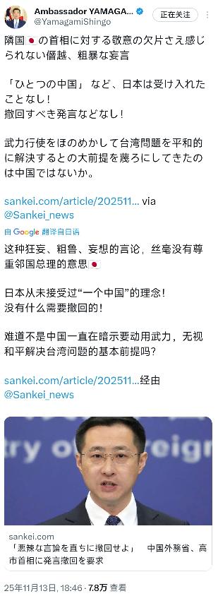 日本驻澳大利亚大使山上信吾(Shingo Yamagami)昨晚(11月13日晚)发文叫嚣道:“这种狂妄、粗鲁、妄想的言论,丝毫没有尊重邻国首相的意思。日本从未接受过‘一个中国’的理念!没有什么需要撤回的!难道不是中国一直在暗示要动用武力,无视和平解决台湾问题的基本前提吗?”   日本驻澳大利亚大使山上信吾昨晚那番话,真是离谱到没边了。说什么“日本从未接受过‘一个中国’的理念”,这哪是外交官该说的话,分明是揣着明白装糊涂,纯属睁眼说瞎话。身为驻外大使,连中日关系的根基都敢乱踩,实在是没底线。   说“没接受”?简直是笑话。中日之间摆着四份实打实的政治文件,每一份都白纸黑字写着日本对“一个中国”的承诺,这既是中日关系的定盘星,也是国际社会都认可的规矩。   先说说1972年的《中日联合声明》,这是两国建交的基础,日本政府在里面写得清清楚楚,承认中华人民共和国政府是中国的唯一合法政府,还明确表示“充分理解和尊重中国政府关于台湾是中华人民共和国领土不可分割的一部分的立场”,甚至承诺要遵守《波茨坦公告》第八条。   要知道,《波茨坦公告》早就敲定了,《开罗宣言》里“日本窃取的台湾归还中国”这话必须算数,日本当年投降时就认了,后来又在联合声明里重申,这不是接受是什么?   再看1978年的《中日和平友好条约》,这可是经过两国议会批准的正经条约,法律效力摆在那儿,赖都赖不掉。条约里特意强调“联合声明所表明的各项原则应予严格遵守”,等于把“一个中国”原则用法律给固定死了。   之后1998年的《中日联合宣言》和2008年的《中日关于全面推进战略互惠关系的联合声明》,又一次次把这个原则重申了一遍,日本还承诺“只同台湾保持民间和地区性往来”,压根不承认台湾有什么“官方身份”。   就在不久前,日本首相石破茂还说“日方坚守1972年日中联合声明的立场没变”,这才过了多久,本国大使就翻脸不认账了?   至于他说“中国暗示动用武力”,更是倒打一耙。台湾问题是中国内战留下的家事,《联合国宪章》都明确支持国家维护主权和领土完整,中国从来没放弃过和平统一的想法。   但为啥要出台《反分裂国家法》?还不是因为“台独”势力总勾连外部势力搞分裂,再加上像山上信吾这样的人在旁边煽风点火。中国这法律针对的是“台独”分裂行径和外国干涉,从来不是冲着和平解决来的——要是没人搞分裂、没人瞎掺和,哪来的“武力风险”?   更讽刺的是,日本在台湾问题上本来就欠着历史债。当年是日本靠侵略战争抢走了台湾,后来靠着《开罗宣言》和《波茨坦公告》才把台湾还回来,这是战后国际秩序的重要一条。现在居然有人跳出来否认“一个中国”,这不光是毁约,更是在碰战后秩序的红线。   做外交官,最基本的就是认事实、守承诺。山上信吾这番话,不光打了自己国家的脸,更是在拆中日关系的台。中日关系能走到今天,靠的就是四份政治文件里的共识和信义。想靠胡言乱语歪曲历史、干涉中国家事,根本行不通,事实就摆在那儿,不是谁喊几句口号就能抹掉的。