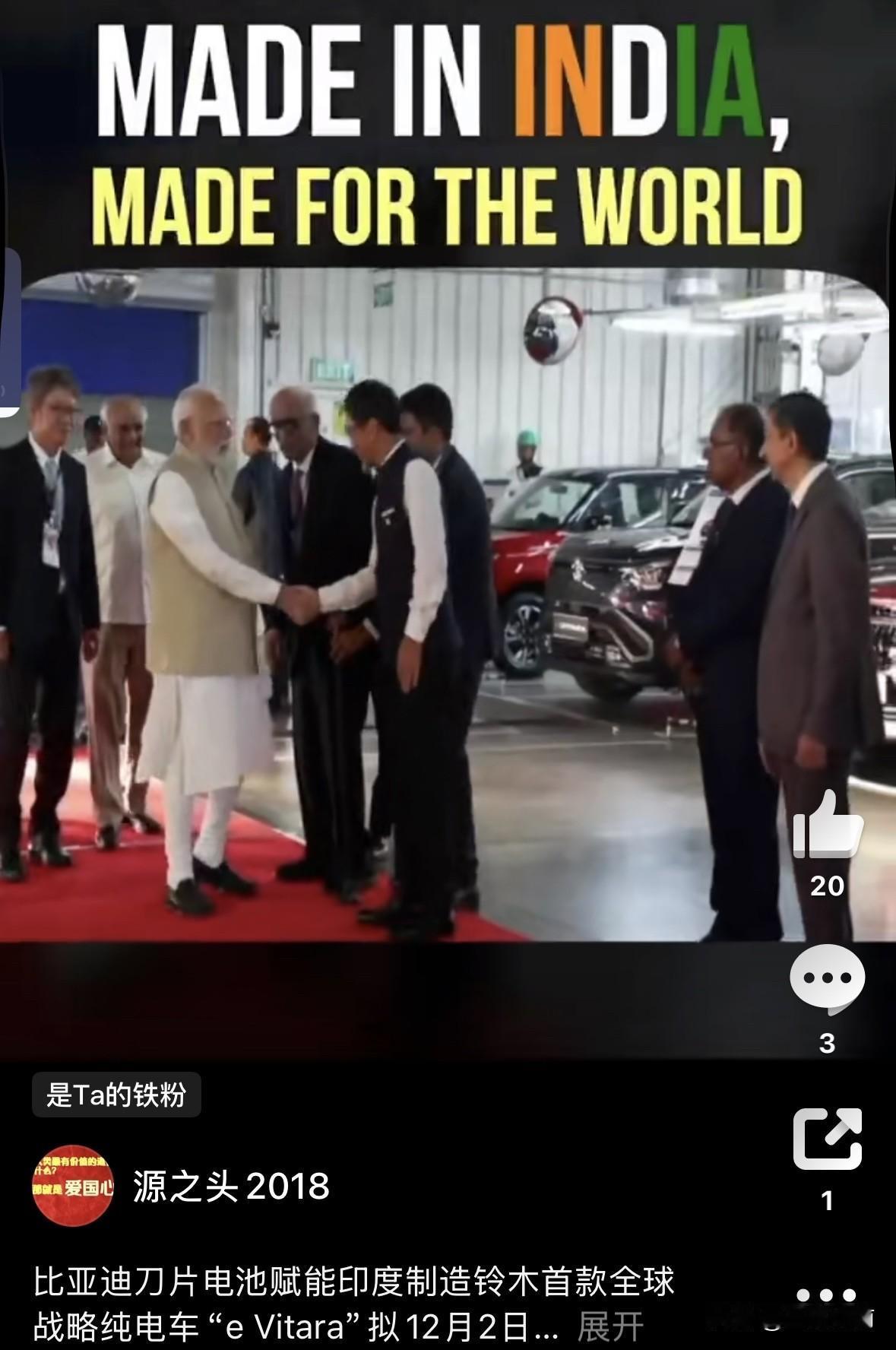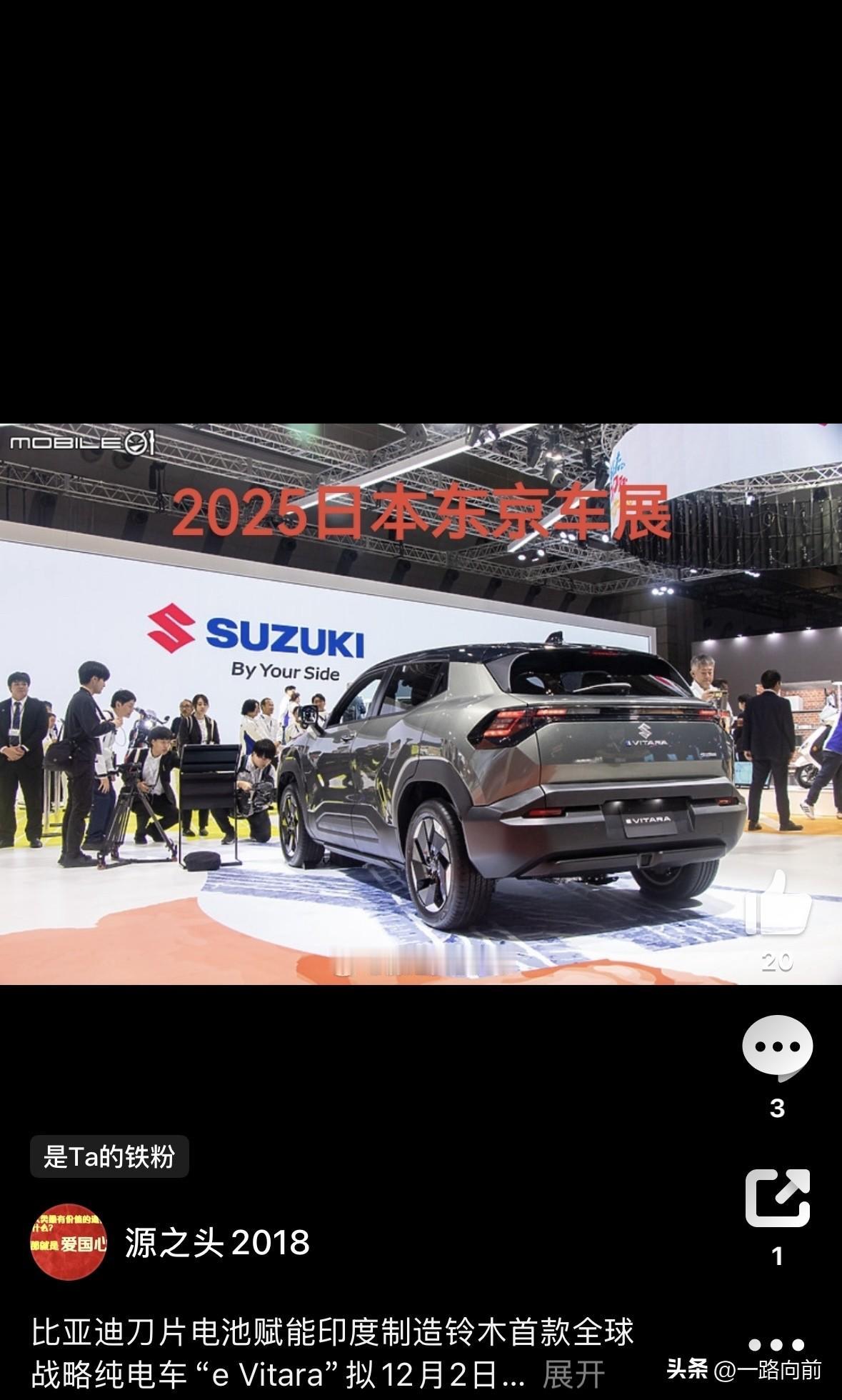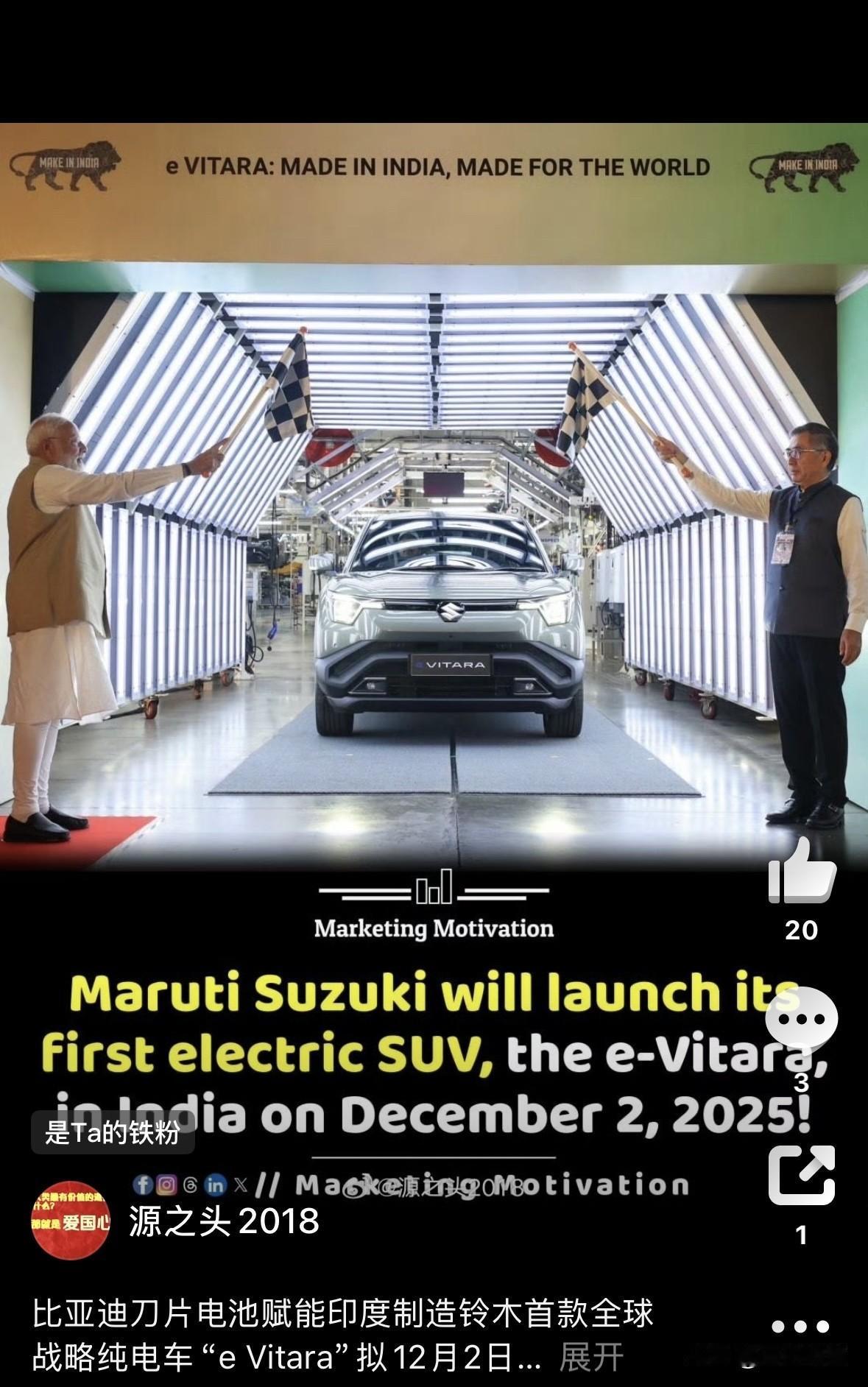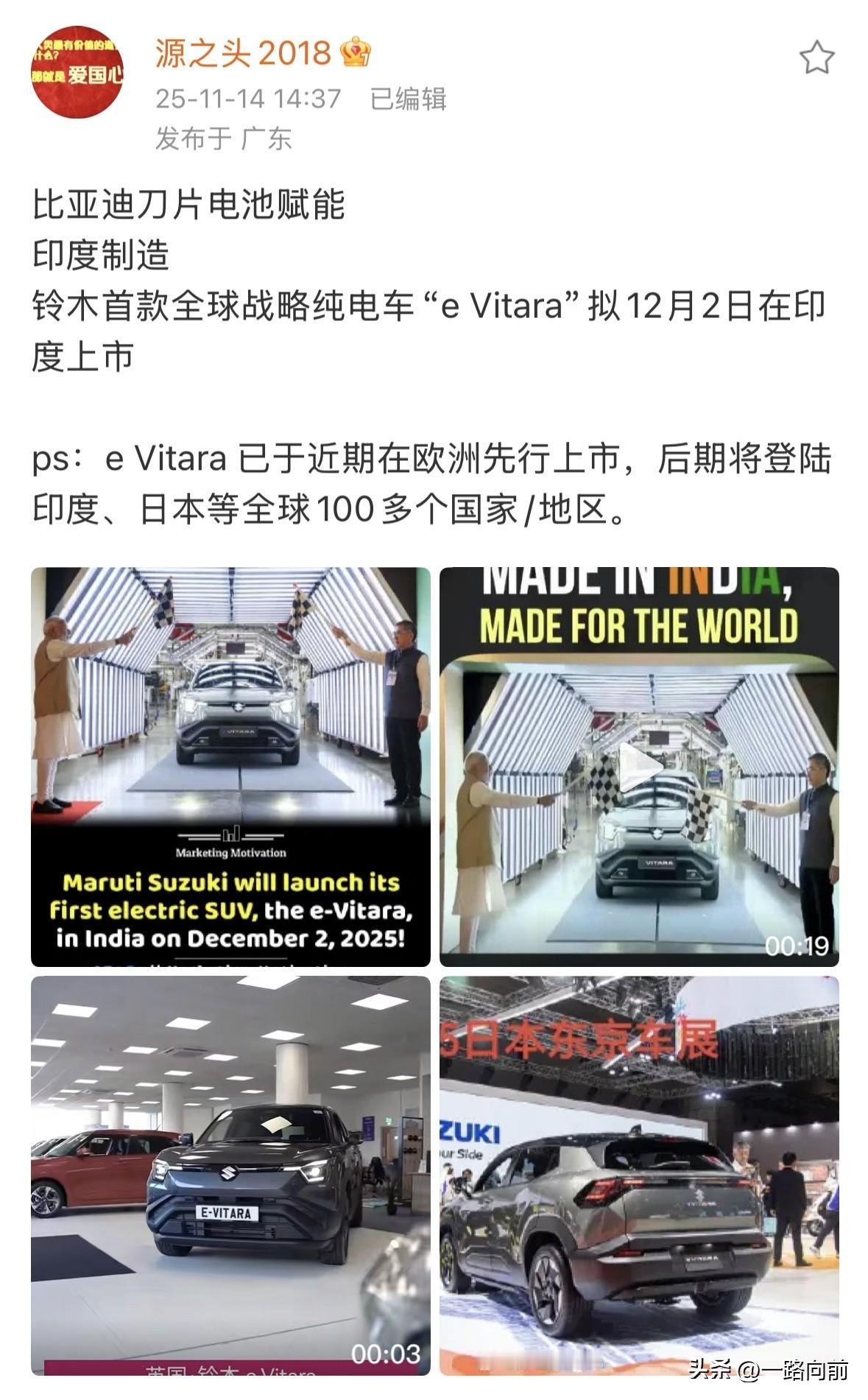 比亚迪刀片电池赋能,印度制造,铃木首款全球战略纯电车“e Vitara”拟12月2日在印度上市,这个阵仗也挺大的,莫迪老仙亲自站台 铃木作为老牌车企,在小型车领域口碑爆棚,但电动化转型一直慢半拍,这次首款全球战略纯电,直接把核心的电池环节交给比亚迪。 铃木之所以选择比亚迪刀片电池,一方面是看中其高安全性和CTP技术带来的空间利用率,另一方面也离不开丰田的牵线——毕竟丰田和比亚迪早有合作,铃木跟着“抄作业”,既省了研发时间,又能保证电池可靠性,简直是双赢。