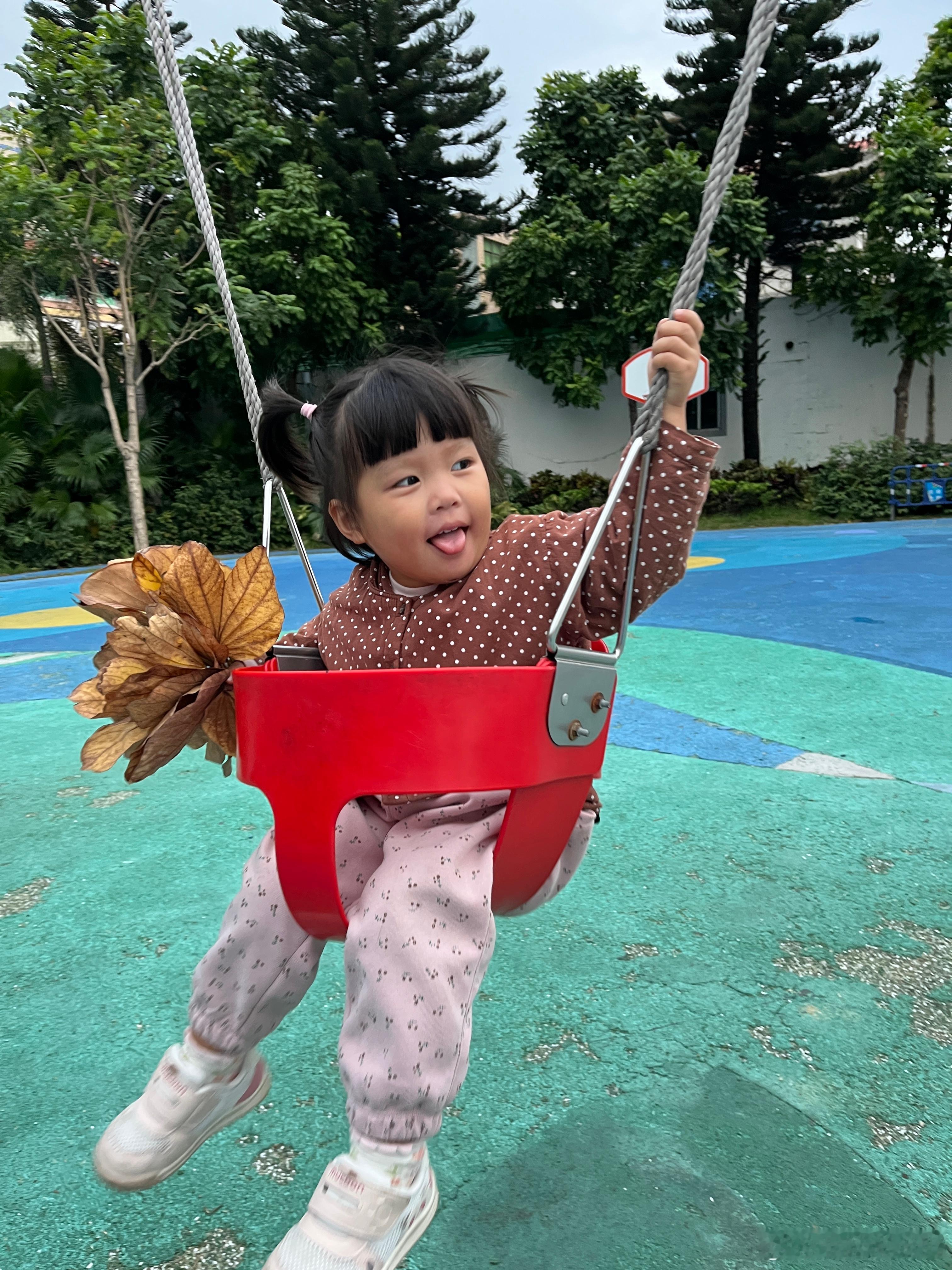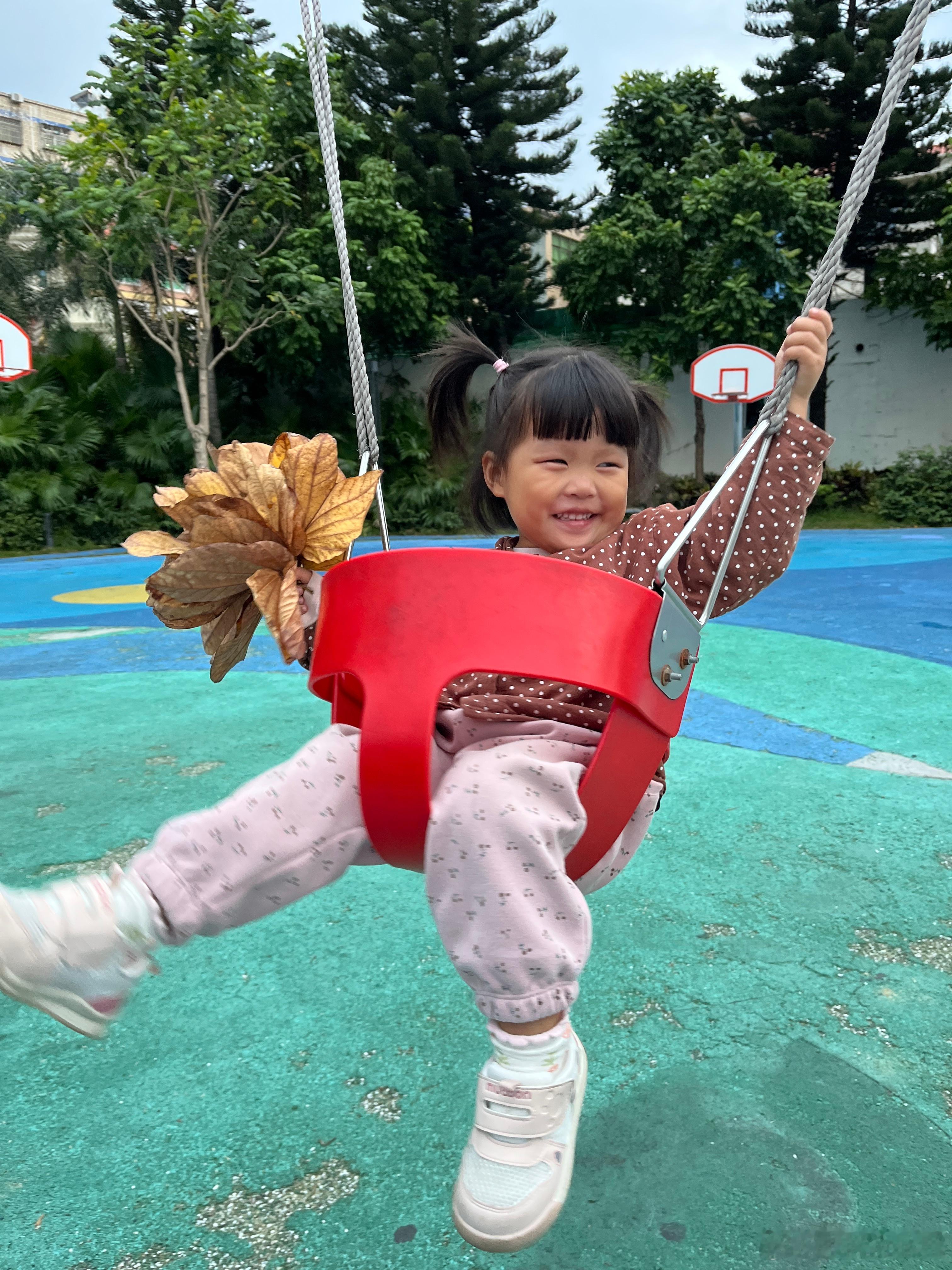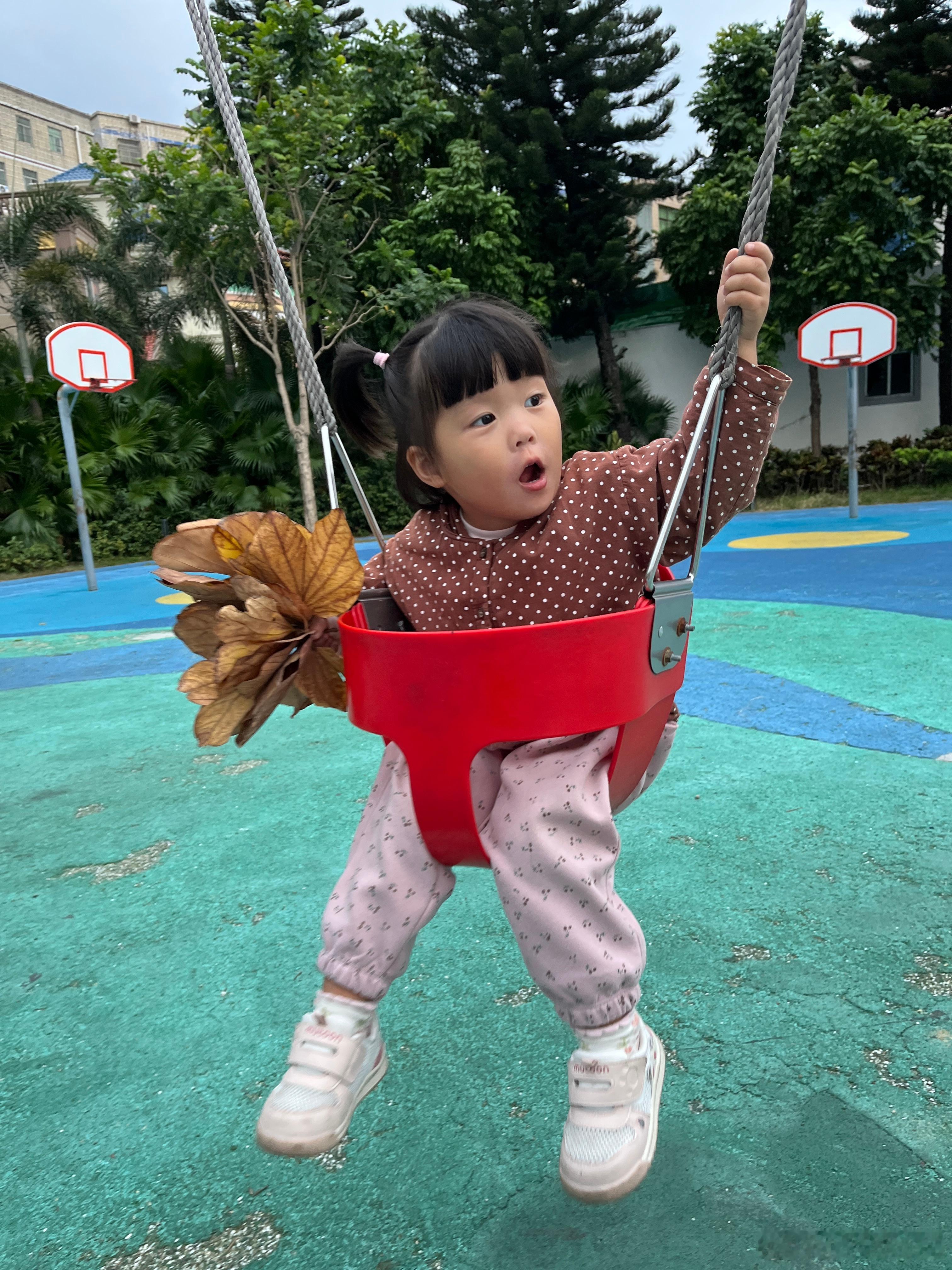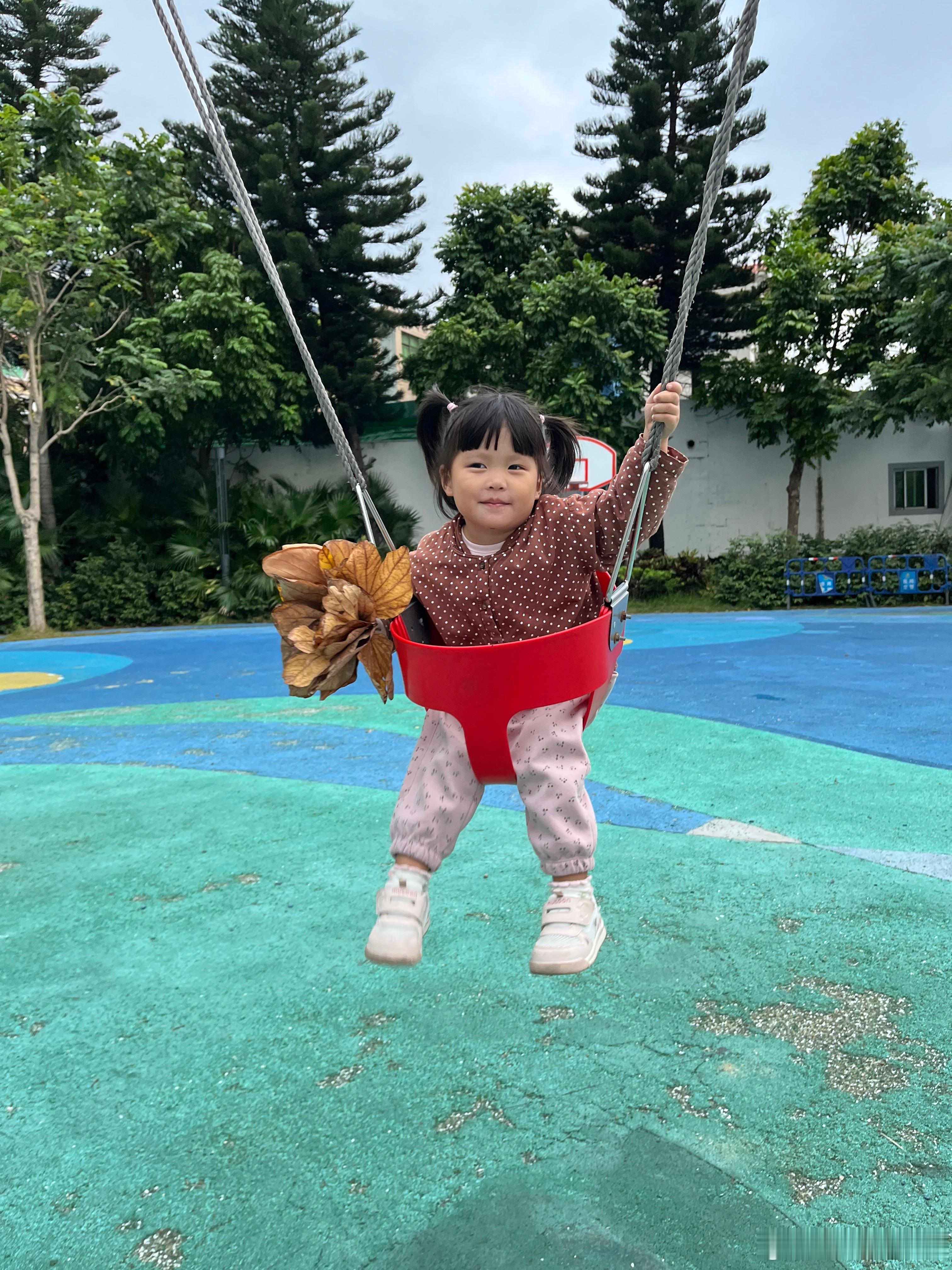 昨天的库存,捡了好多树叶,带着它们荡秋千,好开心。在我心里,她已经是冠军,战胜了