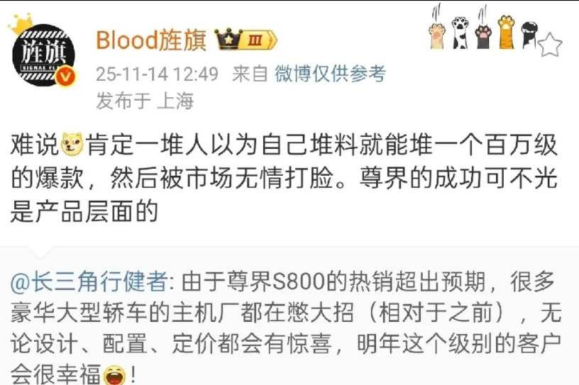 草老师:尊界S800的成功,不仅仅只是产品层面的,只学堆料,最终市场反馈会给他教训的。