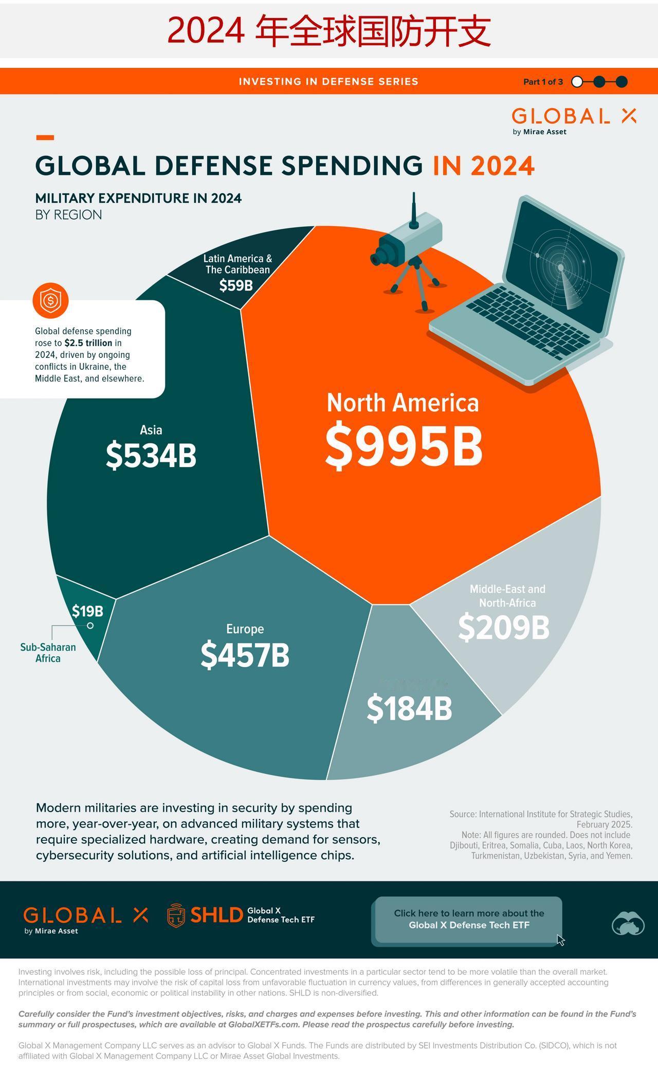 2024 年全球国防支出达 2.5 万亿美元,哪个地区国防开支最大? 在过去十年中,全球国防开支持续增长,这一趋势是由中东、乌克兰以及世界其他地区持续不断的冲突所推动的。 下面图表基于国际战略研究所的数据,显示了全球各地区的国防支出。 ——2024 年全球国防支出 在全球范围内,支出从 2023 年的 2.2 万亿美元增长到了 2024 年的 2.5 万亿美元。 北美地区的国防支出占比遥遥领先。尽管加拿大 2024 年的国防预算增加了 10%,达到该国国内生产总值的 1.2%,但北美地区总计 9950 亿美元的国防开支中,大部分(约 85%)来自美国。 亚洲在支出方面落后于北美。2024 年,该地区共支出 5340 亿美元,其中中国贡献最大,达 2350 亿美元。 ——国防技术的作用 尽管持续不断的冲突对全球国防预算的规模产生了重大影响,但战争中技术作用的增强也促使其规模不断扩大。 如今,许多国家正致力于通过加大对专门国防解决方案的投资来实现军队的现代化。这些解决方案包括高度专业化的硬件,如传感器、网络安全解决方案以及人工智能芯片。 国防行业为投资者提供了独特的多元化投资选择。由于外部因素(而非常规市场周期)往往会影响消费,国防技术为投资者提供了一条独特的多元化投资途径。 国防技术涵盖众多领域,包括大数据和人工智能公司、机器人技术、燃料系统以及飞机制造等。