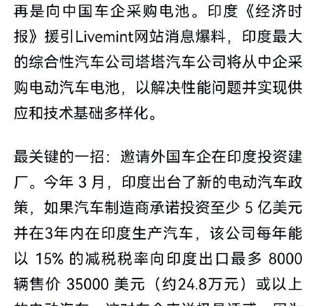 印媒称:“从中国进口电动车电池只是诱惑他们,印度的目标是建立真正的汽车工业,中国就连当跳板的资格都没有。” 印度政府在电动车电池上玩的这手牌,看似开放,其实精明得很。2021年,重工业部批了先进化学电池存储计划,砸1810亿卢比进去,主攻锂离子电池本土生产。计划要求企业逐步抬高本地部件比例,从50%起步,到2024年得达60%以上。这不是随便说说,实际操作中,企业必须把供应链拉到印度来。2024年3月,又出电动乘用车政策,对高端进口电动车关税砍到15%,但得承诺在印度投厂生产本地车型。 中国车企像比亚迪和上汽就动起来了。比亚迪在泰米尔纳德邦投10亿美元建厂,生产电动巴士和乘用车。上汽也跟进测试本地车型。印度这边的逻辑很简单:给你市场和补贴,但核心技术必须落地本土,供应链也得本地化。专家说,这套组合拳针对中国电池市场垄断,中国占全球75%电池芯份额,印度进口依赖90%。不这么干,电动产业就得一直卡在脖子上。结果,本土企业受益大,比如塔塔汽车2024年市场份额超60%,Nexon EV和Curvv卖得飞起。 塔塔汽车的例子最典型。起初他们电池靠进口,2024年8月跟中国欧亿能系统签协议,拿电池包替换自家系统。中国电池每千瓦时80美元,印度本土得翻倍贵。塔塔没就这么依赖下去,2025年1月宣布投15亿美元建千兆工厂,2026年投产磷酸铁锂电池。目标是自产自销,砍掉对华依赖。高管在财报中直说,这步是为了在价格战中保定价权。中国车企进来,竞争肯定激烈。政府PLI方案给塔塔拨款支持,2025年上半年,塔塔电动乘用车销量翻倍,占市场七成。印度汽车产业总值1510亿美元,电动部分冲全球前五。这不单企业事,是国家战略,借电动浪潮翻身。印度想从零建完整产业链,从电池芯到整车组装,全自己把控。中国顶多当临时供应商,没资格做跳板帮印度直接上位。 印度电动车政策这些年变化大。2024年前,进口关税高企,中国电池进不来多少。政策调整后,表面欢迎进口,但附加条件严。企业必须承诺本地化投资,否则关税优惠没了。这吸引了中国巨头,但也让本土玩家加速。塔塔之外,马恒达和奥拉电动也跟进建电池厂。政府还推FAME II方案,补贴本土电动车生产。2025年,电动车销量预计超100万辆,比2024年涨30%。中国出口到印度电动车2024年超40万辆,占大头。但印度本土产能一起来,进口份额就挤压了。专家分析,印度这策略学了中国模式,先引资学技术,再本土取代。结果,中国不干了,觉得补贴偏袒本土,违反贸易规则。 2025年10月16日,中国向世贸组织递投诉,指印度PLI汽车方案、先进化学电池计划和电动乘用车方案违反GATT1994条款。最惠国待遇和国民待遇被点名。这些措施让进口电池和整车吃亏。中国说,印度补贴扭曲市场,本土企业抢单子。投诉列清细节,PLI给本土拨款,本地增值要求排挤外资。印度回应说,政策合规,推动本土制造。双边磋商启动,但分歧大。世贸程序启动,初步审查文件来回。印度汽车协会评估影响,行业面临不确定。中国商务部强调维护利益。这案子可能拖长,影响全球清洁能源贸易。印度坚持补贴促成长,中国指责进口替代。
