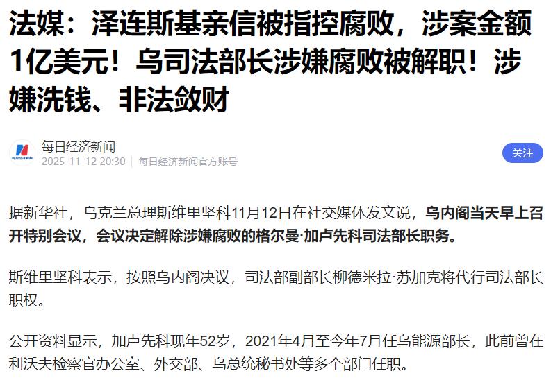 泽连斯基再遭重创,多名亲信涉贪腐被捕;50亿美金被中饱私囊,或彻底激怒特朗普。   乌克兰国家反腐败局近期的70余次搜查行动查获的文件和现金,揭开了这个战时国家腐败网络的冰山一角。这场震动乌政界的贪腐大案,涉案人员名单几乎就是泽连斯基的“核心朋友圈”,从刚被解职的司法部长格尔曼·加卢先科,到泽连斯基当喜剧演员时的生意伙伴铁木尔·明季奇,一个个昔日亲信接连卷入漩涡。   加卢先科这一个人的涉案金额就高达1亿美元,而整个案件的涉案总额据称已逼近50亿美元,这对于正靠着美西方援助度日的乌克兰来说,无疑是往金主们心上捅了一刀。   有意思的是,这起腐败案恰好发生在乌克兰能源基础设施遭俄军轮番空袭、民众挨冻受饿的节骨眼上,泽连斯基政府一边喊着“全民抗俄”的口号,一边却让核心圈子忙着“分蛋糕”,这种反差着实让外界咋舌。   调查显示,涉案人员组成的“庞大犯罪集团”长期在能源领域洗钱敛财,现任和前任能源部官员都是其中关键角色,加卢先科虽然否认指控,但录音证据里他与嫌疑人的对话内容早已让其百口莫辩。   更讽刺的是,就在不久前,泽连斯基还在国际场合标榜乌克兰的“反腐成果”,如今亲信们接连落马,这场“反腐秀”算是彻底演砸了。   而这50亿美元的涉案金额背后,更牵扯着美西方对乌援助的敏感神经。要知道,七国集团刚敲定不久的500亿美元对乌贷款计划中,美国就承诺了200亿美元,这些资金本应用于乌克兰的战后重建和民生保障,现在却有传言称近十分之一可能被中饱私囊。   这种情况要是传到特朗普耳朵里,估计能让这位向来对对外援助斤斤计较的前总统暴跳如雷。   毕竟特朗普任内就曾因怀疑乌克兰贪腐而冻结过对乌援助,如今面对这样的“实锤”,他大概率会抓住机会大做文章,甚至可能联合共和党议员施压,要求重新评估对乌援助政策。   美国国内本就对援助乌克兰存在分歧,民主党主张继续大力支持,共和党则一直质疑资金使用效率,这次贪腐案无疑给了共和党人绝佳的攻击弹药。   要是特朗普真的被彻底激怒,不排除会像当年那样再次冻结援助,或者干脆削减援助规模。对于泽连斯基来说,失去美国这个最大金主的支持,后果不堪设想,前线战事和国内民生都会陷入更大困境。   现在泽连斯基政府算是陷入了两难境地,一方面要应对俄军的军事压力,另一方面还要平息国内民众的愤怒和国际社会的质疑。   解职加卢先科、开展大规模搜查这些动作,更像是为了平息舆论而做的表面文章,毕竟涉案的核心人物大多与他关系密切,真要彻查下去,恐怕会引火烧身。但如果处理不力,不仅会失去美西方的信任,自己的执政地位也可能受到动摇。   这场贪腐风暴究竟会如何收场,泽连斯基又能否在保住权力的同时挽回金主的心,恐怕还要看接下来美国方面的反应,尤其是特朗普的态度。   毕竟50亿美元可不是小数目,足以让美国的对乌政策发生急转弯。