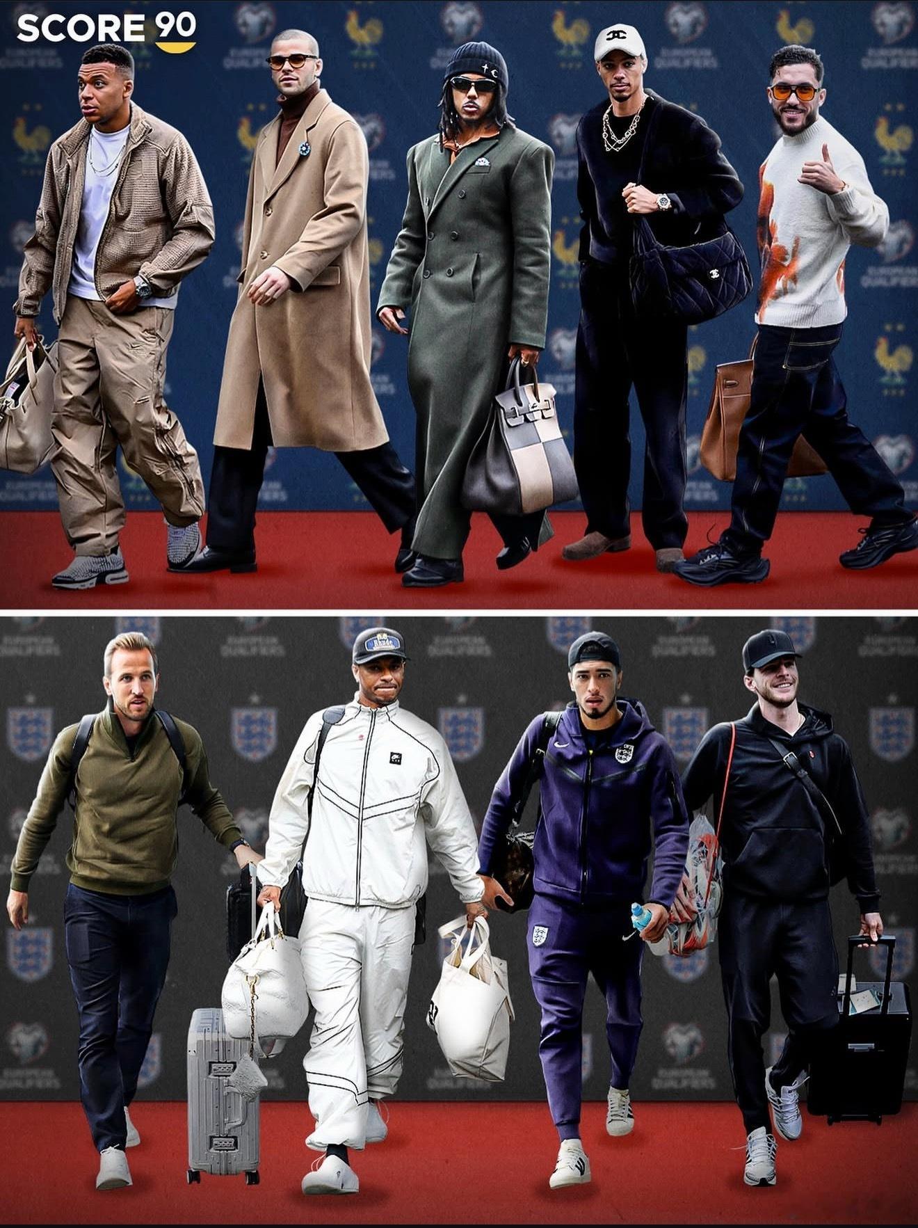 在和乌克兰4比0比赛中,埃基蒂克打进了自己代表法国成年国家队的第一个进球,法国队也提前一轮成功进军明年世界杯决赛圈。图二是法国国脚在国家队训练营报到和英格兰队球员报到的对比。法国国脚每次来国家队报到的时候,精心搭配的着装已成风气,虽然在镜头前亮相也就是下车步入基地建筑的短短几步路,当然,要论穿搭这件事,无人能和孔德相比,这位巴萨球员每次来法国国家队报到,穿的都像来T台走秀。(图七到图十二)