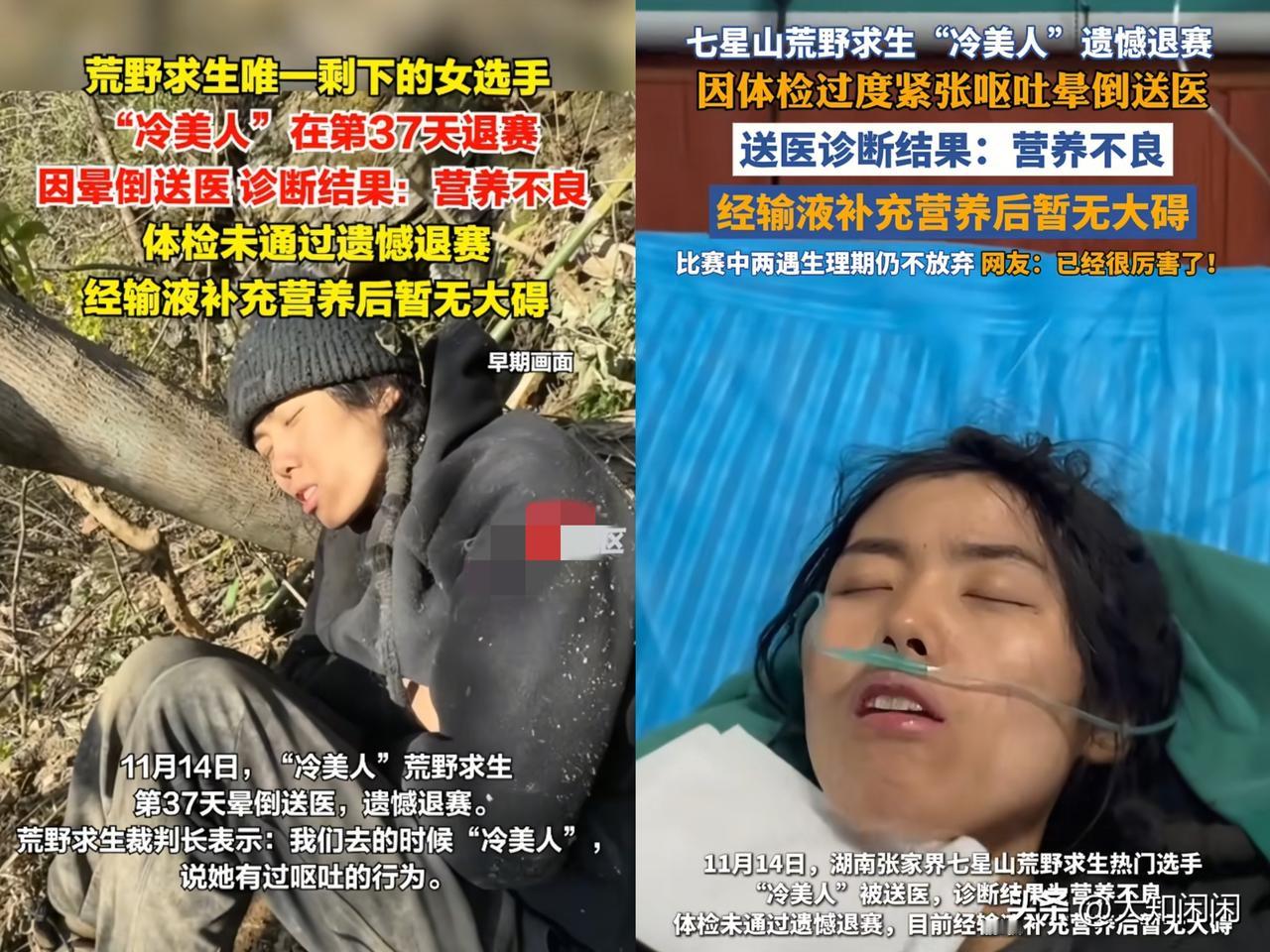冷美人退赛了! 有想过她会被毒虫咬退赛, 也想过她扛不住暴雨放弃,但咋也没想到 最后是晕倒送医,体检没过不得不退。看到工作人员抱她上病床,那单薄的样子,我这心里一阵泛酸。和其他选手比,她实力或许不是最强,可在我心里,她就是“冠军”!两次生理期都咬牙撑着,发烧39度还蒸野菜吃,瘦了15公斤,指甲缝全是泥,从没喊过苦,也没放弃。 眼瞅着胜利在望,却因营养不良晕倒。退赛其实也好,身体才是本钱呐。她已经用行动证明了自己的坚韧。大家说,这样的“冷美人”是不是超厉害?