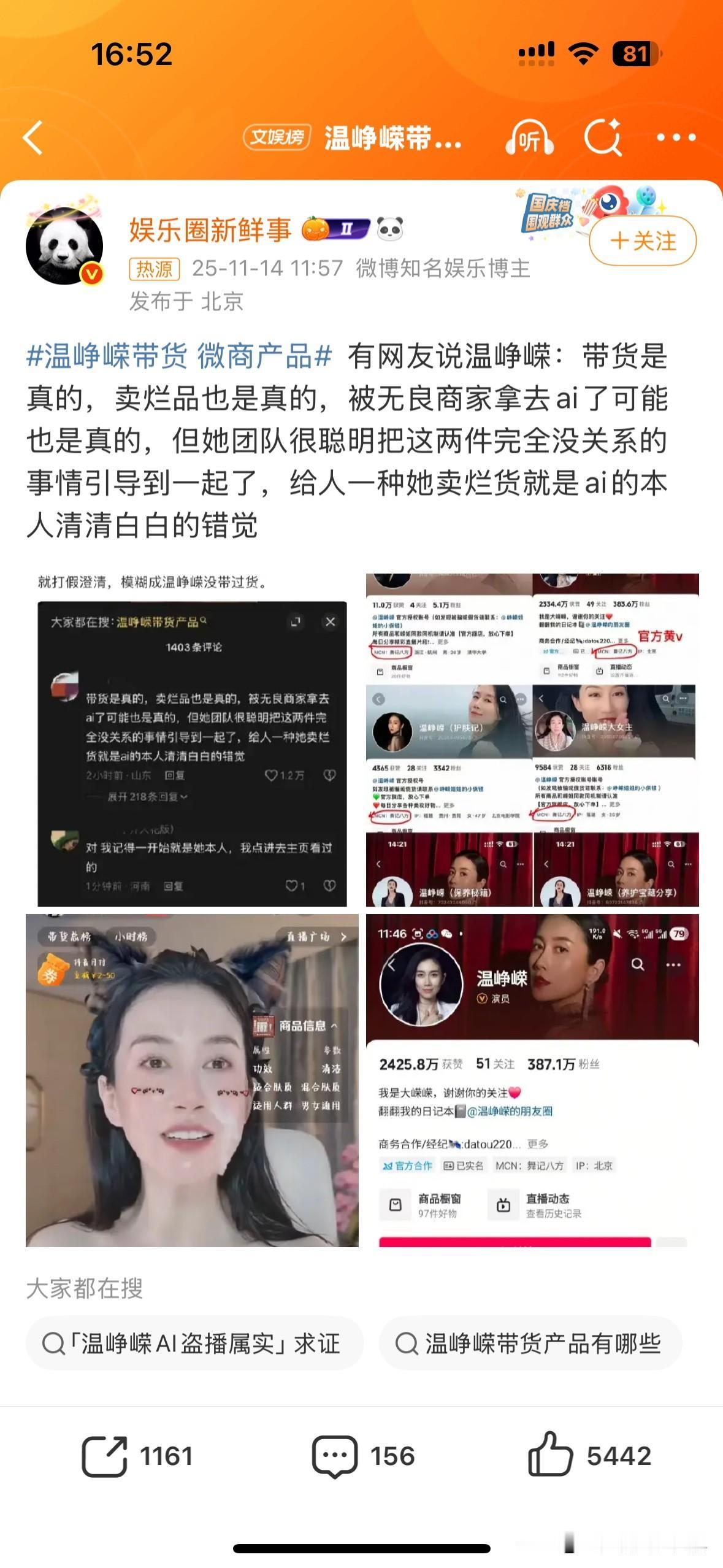 温峥嵘直播卖货这件事,直接干成了直播界“罗生门”。看到好多温峥嵘(不知是本人还是AI)在卖各种东西,也看到温峥嵘(不知是本人还是AI)出来辟谣说卖货的不是温峥嵘本人而是AI。 哈哈,说真话,我们真的分不清,分不清啊! 到底哪个是真人哪个是AI? 还是说卖货的都是本人,辟谣的也是本人呢? 然后一股脑的甩锅给AI?