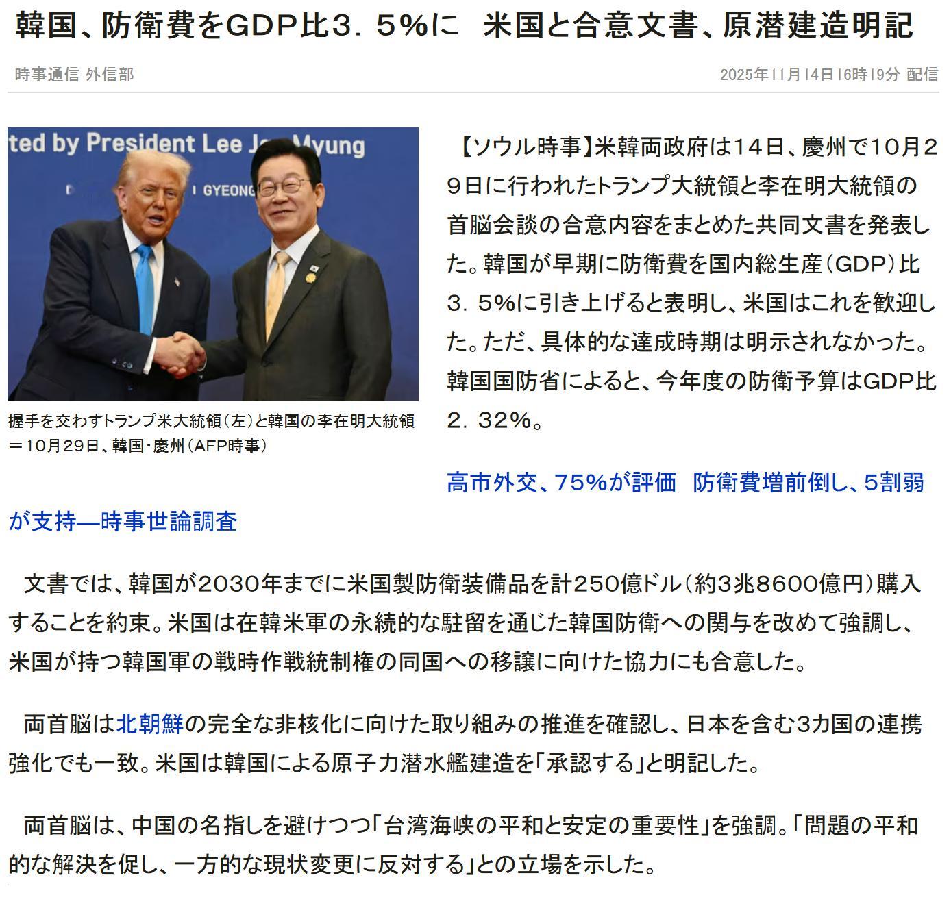 今日强韩——美帝正式批准强韩建造SSN——强韩的国防开支比重将提到3.5%——到2030年强韩将向美帝采购250亿刀武器装备——美军将继续在韩国永久驻留——韩军战时指挥权将移交强韩——韩美日三国继续强调北棒的无核化——韩美反对台海单方面改变现状