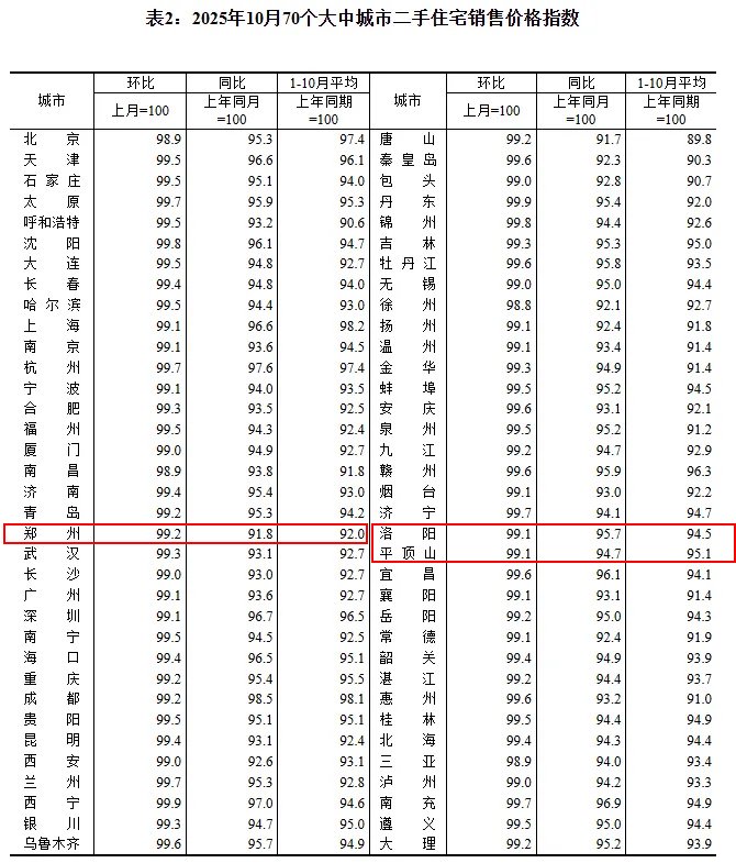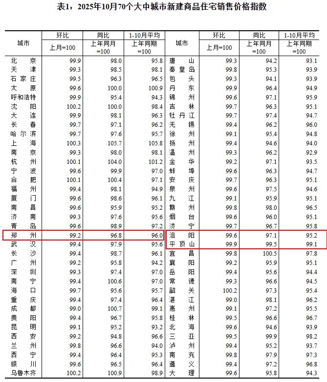 11月14日,据国家统计局消息,2025年10月份,70个大中城市中,各线城市商品住宅销售价格环比和同比均下降。