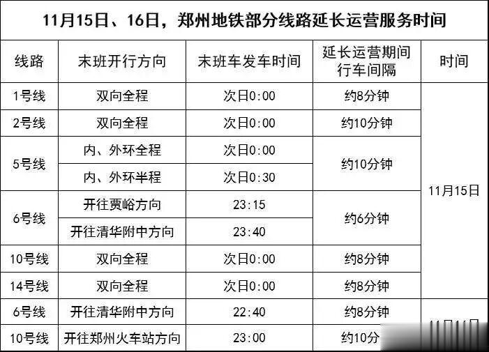 11月15日、16日,郑州奥林匹克体育中心将举行大型活动,郑州地铁部分线路延长运营服务时间。