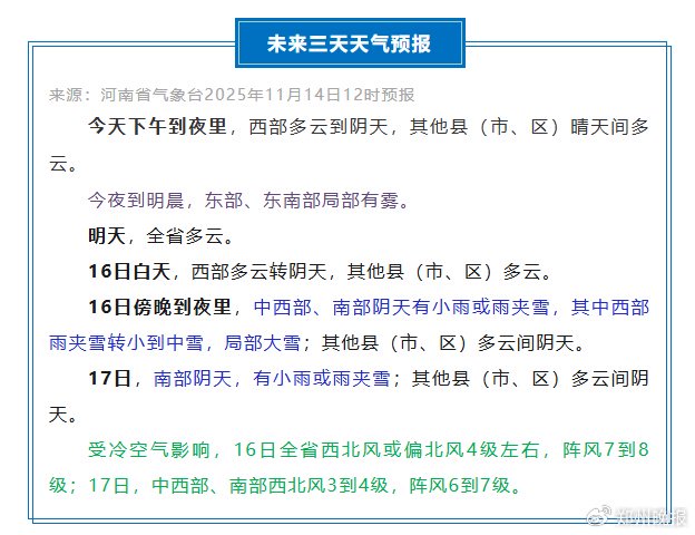 河南今明两天以晴或多云为主,午后多地最高气温20℃+;16日一早强冷空气抵达西部,当晚覆盖全省,将带来大风、雨雪及强降温。16日全省西北风或偏北风4级左右,阵风7~8级,16日傍晚到17日,中西部、南部有小雨或雨夹雪;16日傍晚到夜里,西部雨夹雪转小到中雪,局部大雪;17日随着气温进一步下降,南部预计有小雨或雨夹雪;17日全省最高气温降至5℃~8℃,18日凌晨最低气温跌破冰点,西部山区-8℃~-4℃,19日白天起气温回升。
