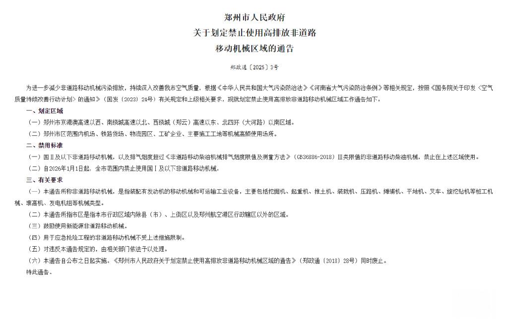 为进一步减少非道路移动机械污染排放,持续深入改善我市空气质量,根据《中华人民共和国大气污染防治法》《河南省大气污染防治条例》等相关规定,按照《国务院关于印发〈空气质量持续改善行动计划〉的通知》(国发〔2023〕24号)有关规定和上级相关要求,现就划定禁止使用高排放非道路移动机械区域工作通告如下: