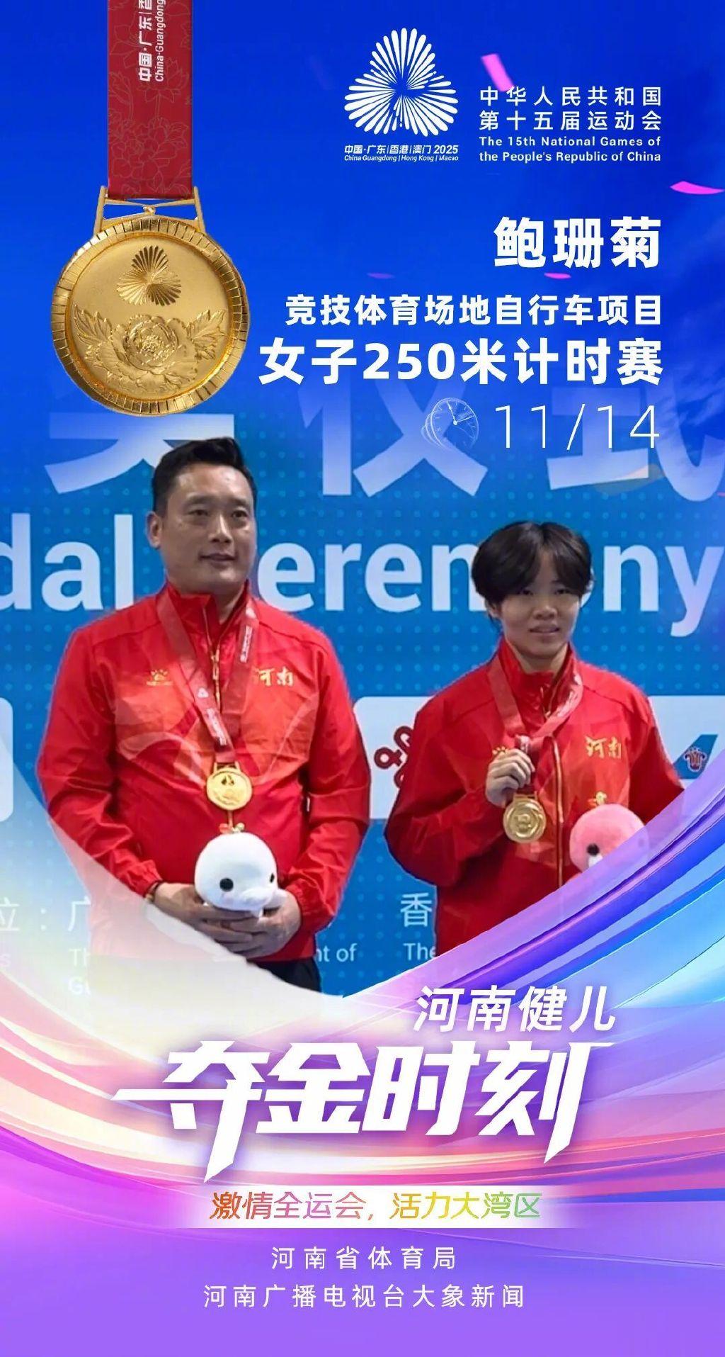 11月14日,中华人民共和国第十五届运动会竞技体育比赛场地自行车项目决赛在香港单车馆举行,河南选手鲍珊菊发挥出色,勇夺女子250米计时赛冠军,这是河南代表团在十五运会竞技体育比赛中收获的第六枚金牌。