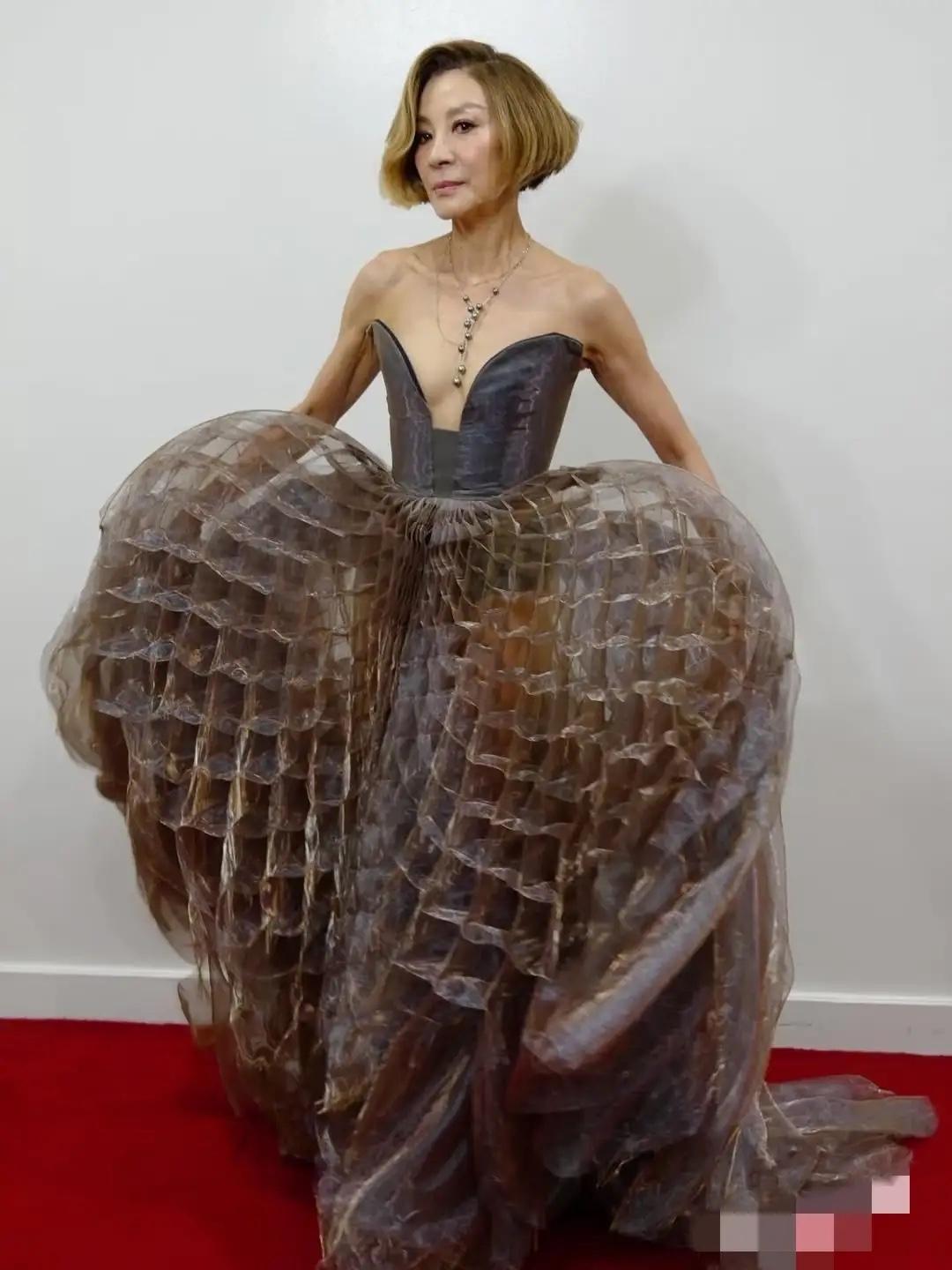 杨紫琼这身材太吓人了 63岁杨紫琼新加坡红毯造型太颠覆!棕黄色齐耳短发配高定礼服