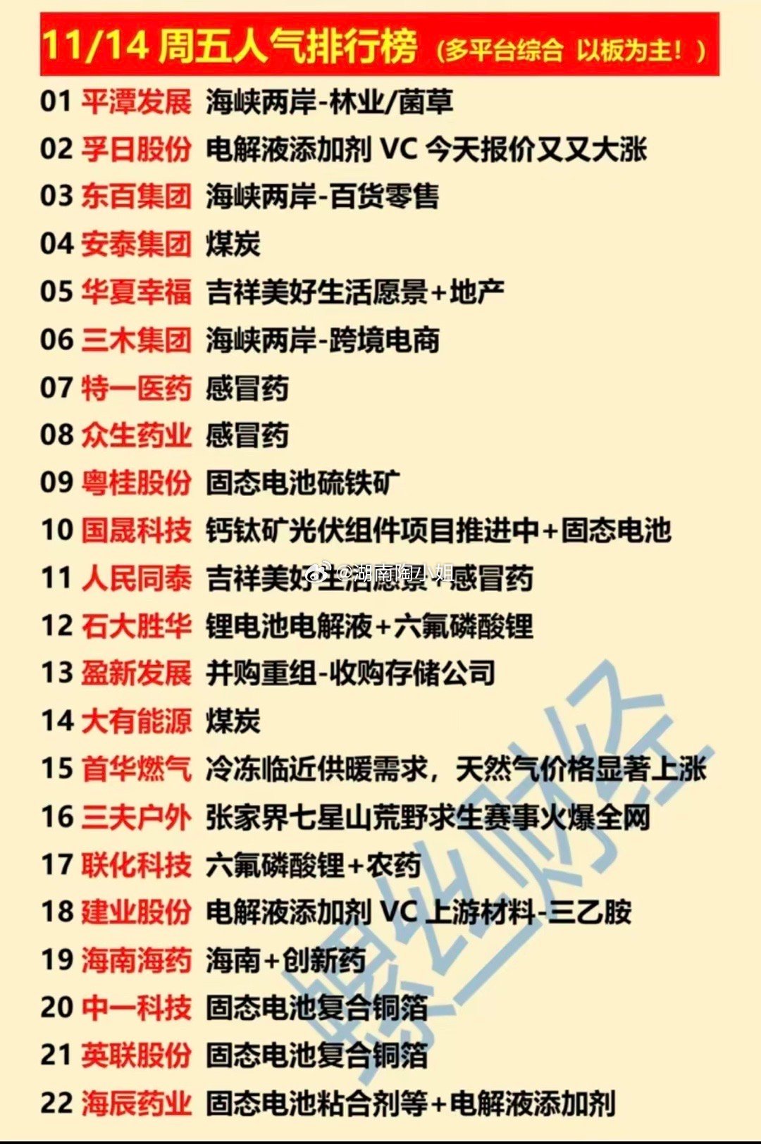 11/14周五 涨停板股票 人气龙虎榜!01平潭发展:海峡两岸-林业/菌草02孚日股份:电解液添加剂VC报价大涨03东百集团:海峡两岸-百货零售04安泰集团:煤炭05华夏幸福:吉祥美好生活愿景+地产06三木集团:海峡两岸-跨境电商07特一医药:感冒药08众生药业:感冒药09粤桂股份:固态电池硫铁矿10国晟科技:钙钛矿光伏组件+固态电池