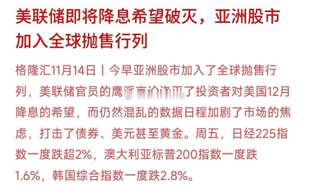 今天A股大跌的原因找到了,原来又是外围在作妖今天A股收盘跌0.97%,今天几乎所有板块都处于下跌状态,就连银行板块最后都在下落,可见今天的盘面有多少恐慌盘。下跌的原因也很简单,就是美联储官员发表了鹰派言论,认为12月降息是不必要的,昨晚美股就是出现了暴跌,而且今天盘前还在下跌。说明世界资金市场都受到了影响,所以今天A股直接跌破了4000点,而且如此下跌,如果周末没有重磅利好下周将会继续下跌。至于下周就看哪个板块率先反弹了,将会是下周的重点。