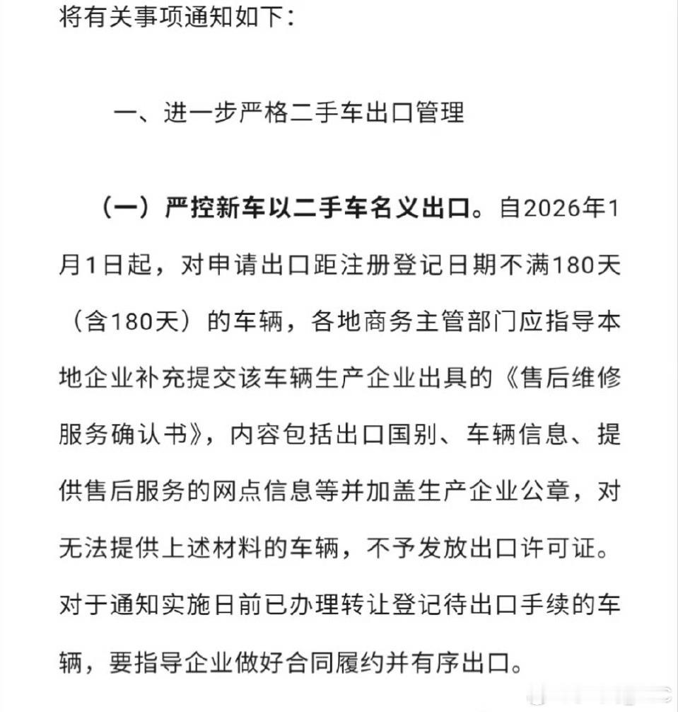 商务部,工业和信息化部,公安部,海关总署四部门明确自2026年1月1日起严控新车以二手车名义出口,对申请出口距注册登记日期不满180天(含180天)的车辆,各地商务主管部门应指导本地企业补充提交该车辆生产企业出具的《售后维修服务确认书》。“零公里二手车”已经不算什么新闻了,一些车企为了冲销量把新车当二手车卖来冲销量。还有一个原因,新车出口和二手车出口的门槛完全不一样,新车出口门槛很高,资质不一样的,新车出口起步就要几十辆,二手车出口一台两台就能安排。当然最重要的就是新车到当地的认证要求很高,二手车会低不少。