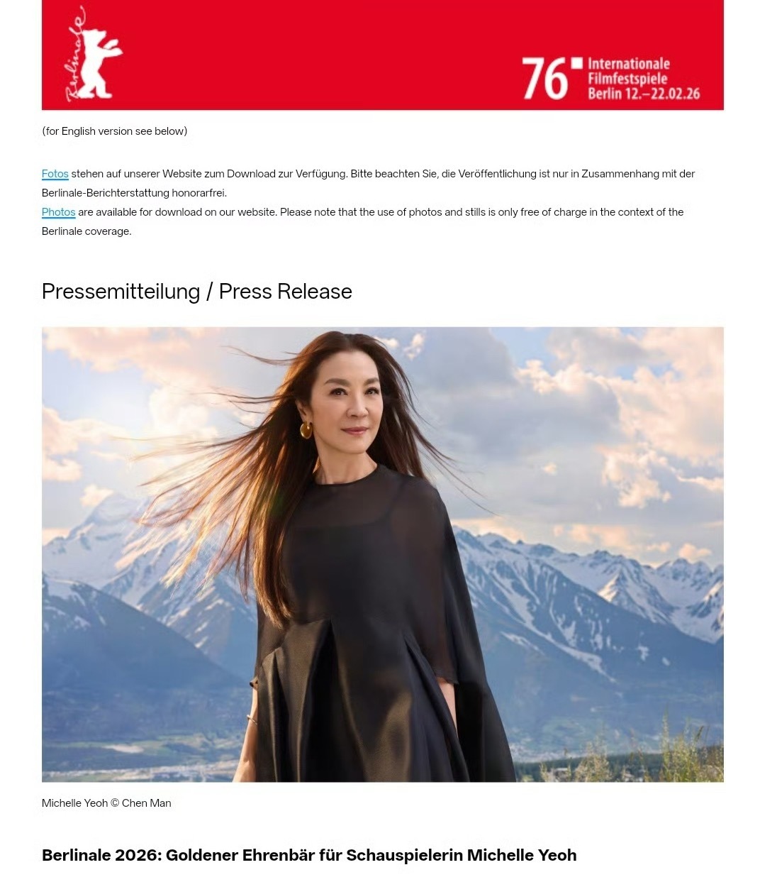 柏林电影节官宣,奥斯卡影后杨紫琼将获第76届柏林电影节终身成就金熊奖,她也成为获得该奖项的首位华裔电影人,颁奖典礼将于2026年2月12日柏林电影节的开幕式上举行。