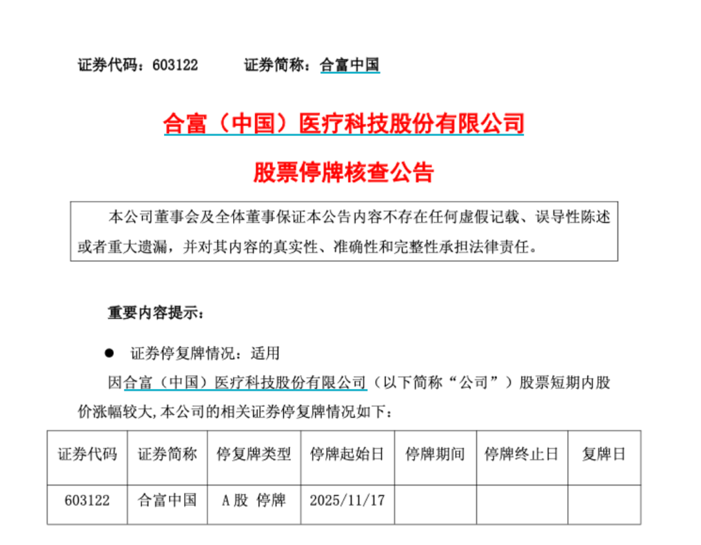 经向上交所申请,合富中国将于2025年11月17日(星期一)开市起停牌,自披露核查公告后复牌。