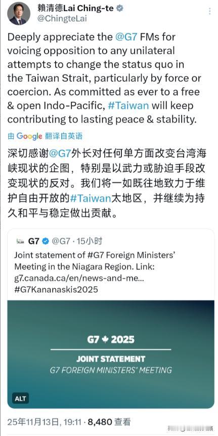 赖清德11月13日晚发文写道:“深切感谢G7外长对任何单方面改变台湾海峡现状的企图,特别是以武力或胁迫手段改变现状的反对。我们将一如既往地致力于维护自由开放的印太地区,台湾将继续为实现持久和平与稳定作出贡献。” 赖清德这篇文发得倒是挺及时,G7 外长会刚开完,他立马就凑上去表感谢,那股子找靠山的劲儿藏都藏不住。 字里行间全是想靠着外人给自己壮胆的心思,仿佛 G7 的几句话就能成他的 “护身符”,能让他那些见不得光的心思得逞似的。 他嘴里喊着 “反对单方面改变现状”,这话听着就好笑,到底是谁在处心积虑想改变现状?台湾从根上就是中国的一部分,这是写在历史里、刻在法理上的事儿,从来不是什么可以含糊的 “现状”。 倒是他自己,一边兜售 “互不隶属” 的谬论,一边想方设法勾连外部势力,这不就是明摆着要打破两岸同属一个中国的根本现状吗?现在倒好,反过来把帽子扣别人头上,这颠倒黑白的本事也是练得够熟。 还说要 “维护自由开放的印太地区”“作出贡献”,这话听着更虚。台湾就是中国的一个地区,连参与国际组织都得在一个中国原则下才行,哪来的资格以 “台湾” 的名义去谈什么印太地区的维护? 说白了,这就是给自己的 “倚外谋独” 行径贴金,想把中国的内政问题包装成国际议题,拉着外人来插手,好给统一进程添堵。 G7 那帮人本来就没安什么好心,开会的时候把台海问题扯进来,本质上就是想借着这个由头干涉中国内政,给自己的霸权私心找借口。 他们的声明里满是双重标准,自己到处插手别国内政的时候不提 “改变现状”,到了台海问题上倒装起了 “和平卫士”,这种把戏早就被看穿了。 可赖清德偏不,人家稍微递个话头,他就赶紧凑上去感恩戴德,把别人的干涉当恩惠,把自己的民族立场抛到一边,这 “卖台求荣” 的嘴脸藏都藏不住。 更有意思的是,G7 内部本身就不是一条心,有的国家想着靠对华合作救自己的经济,有的还在为其他地区的冲突闹分歧,真能拧成一股绳来管台海的事?恐怕未必。 他们也就是嘴上喊得凶,真要动真格的,首先得掂量掂量自己的利益。赖清德把这种表面上的支持当成真靠山,未免也太天真了,到最后大概率是被当成棋子利用完就扔,自己还得落个里外不是人的下场。 他大概忘了,之前就因为反复搞 “台独” 挑衅,不光被骂成 “麻烦制造者”,连不少外国舆论都看不过去,说他是在把台海往危险的地方推。现在靠着 G7 的几句话就觉得有恃无恐,简直是自欺欺人。 中国的主权和领土完整从来不是谁能随便挑衅的,不管是找 G7 还是找别的什么外部势力,都改变不了台湾终将回归祖国的事实。 这种靠着外人撑腰就想搞分裂的行径,说白了就是没底气。以为抱上了别人的大腿就能高枕无忧,却不知道外部势力从来都是只讲利益不讲情面,真到了关键时候,最先被牺牲的就是他这种棋子。 而且岛内的民众也不是傻子,谁真的为台湾好,谁是在把台湾往火坑里推,看得清清楚楚。 赖清德这篇文看似是在表决心、找支持,实际上不过是又一次暴露了自己 “倚外谋独” 的野心。 他大概以为这样能给统一进程制造阻碍,却不知道这种挑衅只会让统一的脚步更坚定。 不管他怎么折腾,怎么找外人站台,都改变不了最后的结局,毕竟分裂国家的事儿,从来就没有成功的可能,也从来没有好下场。 参考文章:菲常视野陈菲 11.13 赖清德今晚(11月13日晚)发文写道
