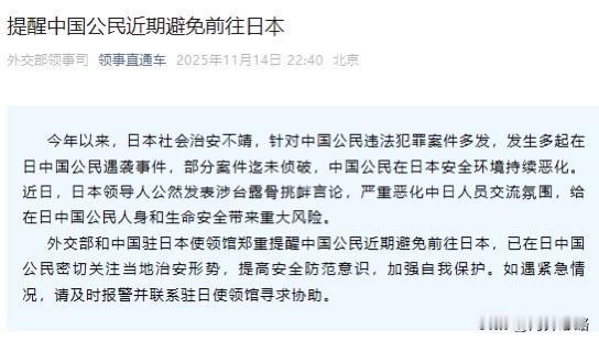 事态严重了,由于日本首相高市早苗拒绝撤回“武力干涉两岸统一”的发言,日方还倒打一耙、颠倒黑白攻击诋毁我国驻日外交人员,导致中日关系急剧恶化,中方在11月14日郑重发布紧急通知:提醒中国公民近期避免前往日本。 个人观点: 1、公开提醒我国公民避免前往日本,原因是日本治安持续恶化。潜台词可能就是:一旦日本挑起战争,在日本将不再安全,因此不要去日本! 2、日本极右翼法西斯势力抬头,高市早苗还在煽动仇中情绪,因此中国游客在日本很可能遭遇不测。 3、旅游业是日本地位支柱产业,其利润甚至超过了汽车业。高市早苗既然给脸不要脸,持续冲撞中方的底线,中方也没必要惯着,直接出狠手教训。 4、大陆民众要做好战争准备,高市早苗是一个军国主义败类,极为激进,不排除日本会重演偷袭珍珠港。 5、一旦日本开了第一枪,大陆将新仇旧恨一起算,用沈逸教授地位话来说,就是断其祭祀,绝其苗裔。 这次,绝不让日本像二战结束后那样逃脱罪责,必须让这个罪恶的国家付出应有的代价。