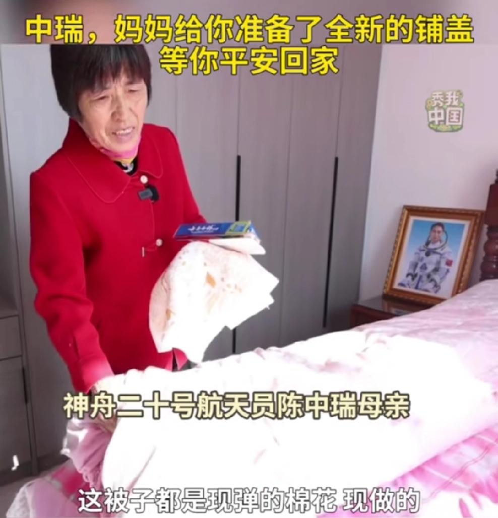 神舟二十号航天员陈中瑞已安全顺利出舱,陈妈妈早早地就给儿子准备了全新的铺盖,等待儿子平安回家。她给儿子买的新的牙膏牙刷,新的毛巾,陈妈妈说被子都是现弹的棉花现做的,这一幕太戳人了,母爱真的太伟大了! 陈妈妈在生活里或许是一个普通的母亲,但在这一刻,她的爱却无比耀眼。她用这些平凡又温暖的举动,诠释了母爱的深沉。在儿子为国家出征太空时,她在后方默默守护,把所有的爱都倾注在这些生活的小细节里!我被这份母爱感动哭了。