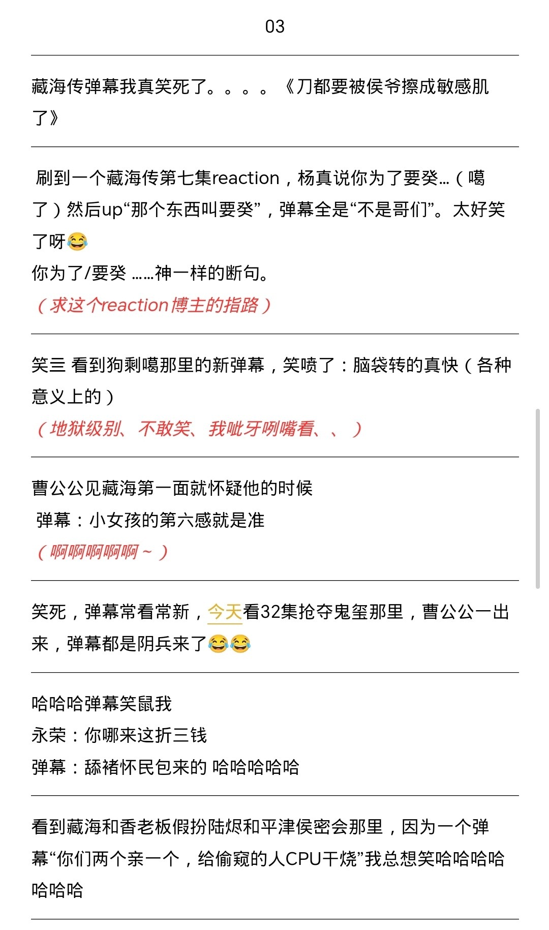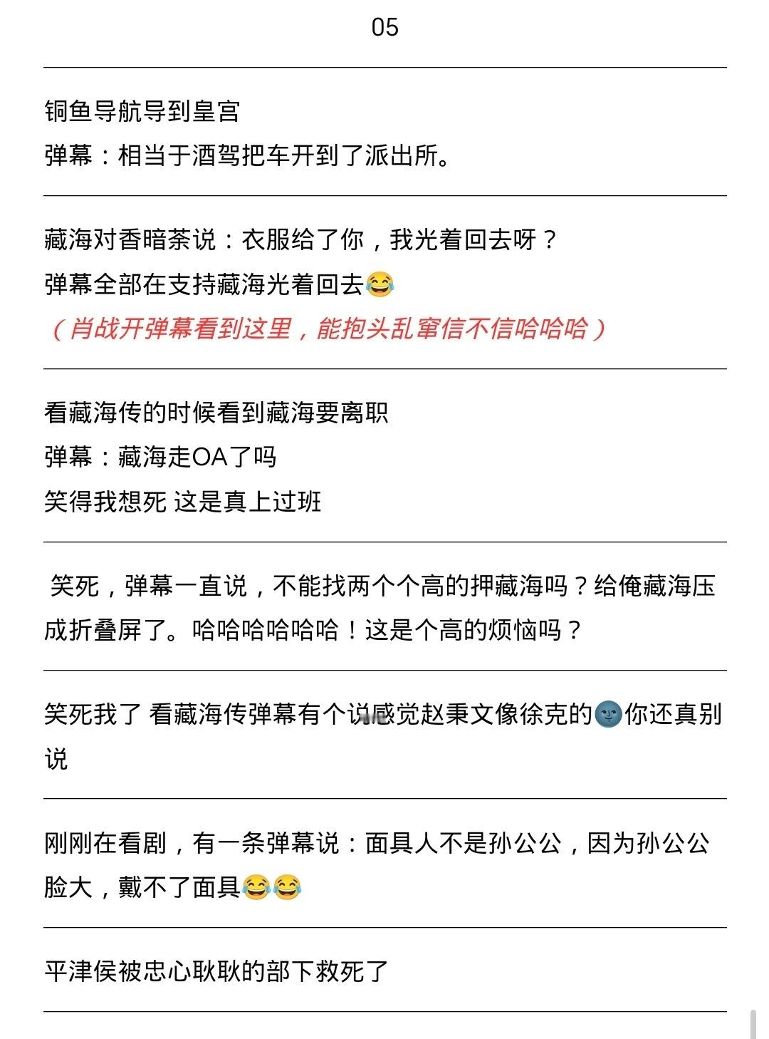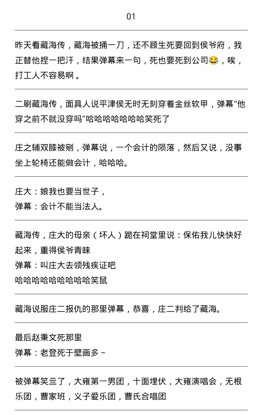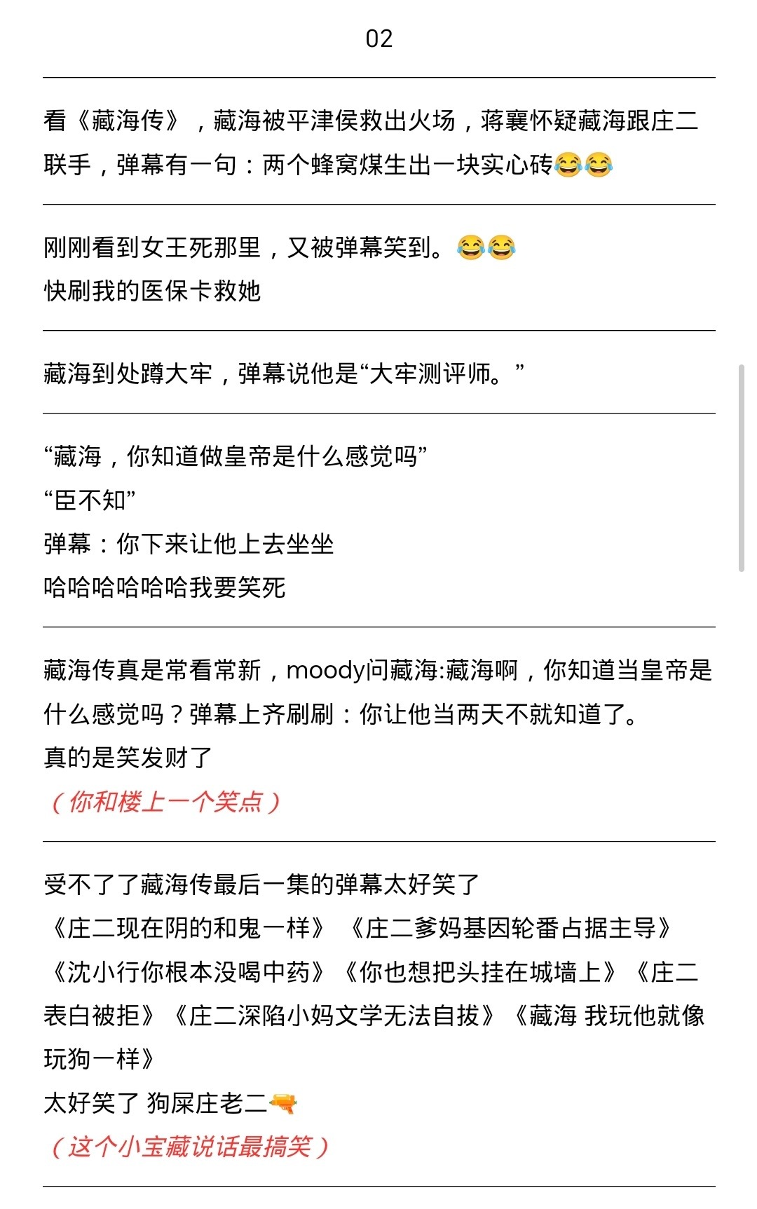 藏海传的弹幕能笑到你打鸣!一些《藏海传》弹幕repo分享给大家因为真的好好笑!藏海传一定要配合后面多起起来的弹幕看一遍,太有活儿了,比小品更有乐子。第一批实时追剧的观众记得二刷开弹幕,看看自己是不是错过了后面好多新出的梗。