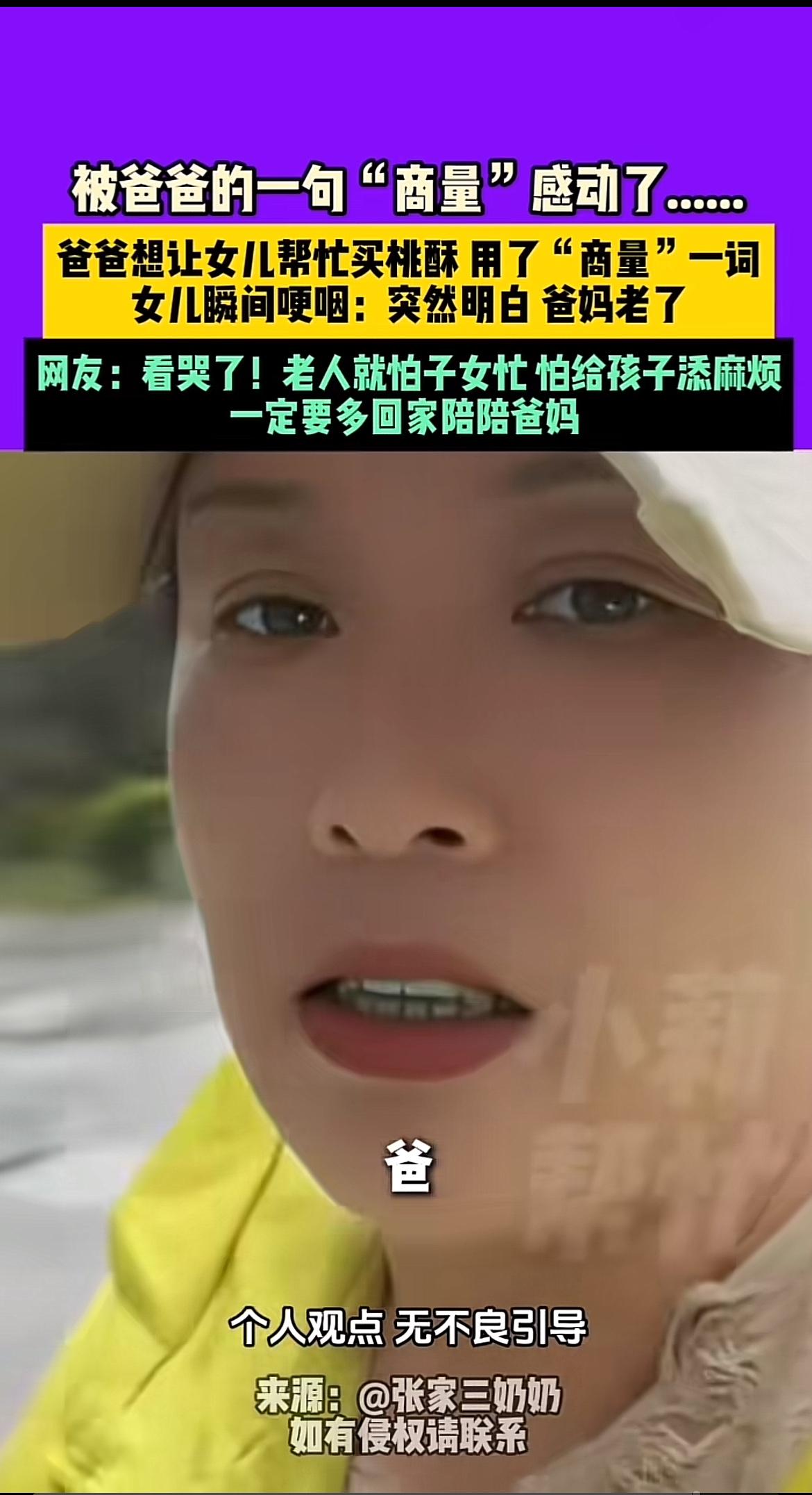 看到“被爸爸的一句‘商量’感动了”,我深有感触。之前看到一则视频,下雨天父亲想让女儿买桃酥,开口却是“闺女,我想跟你商量一件事”。这声“商量”,让人心酸。曾经那个扛起家里大小事的父亲,如今连让孩子帮小忙都小心翼翼。 我也有类似经历,陪爸爸去银行,他输密码时手指颤抖,那一刻我心里五味杂陈。爸妈一示弱,我们会有“角色反转焦虑”,怕担事、愧疚、想逃。但逃不掉,生活里他们需要我们的时刻越来越多,这就是亲情的无奈与责任啊。